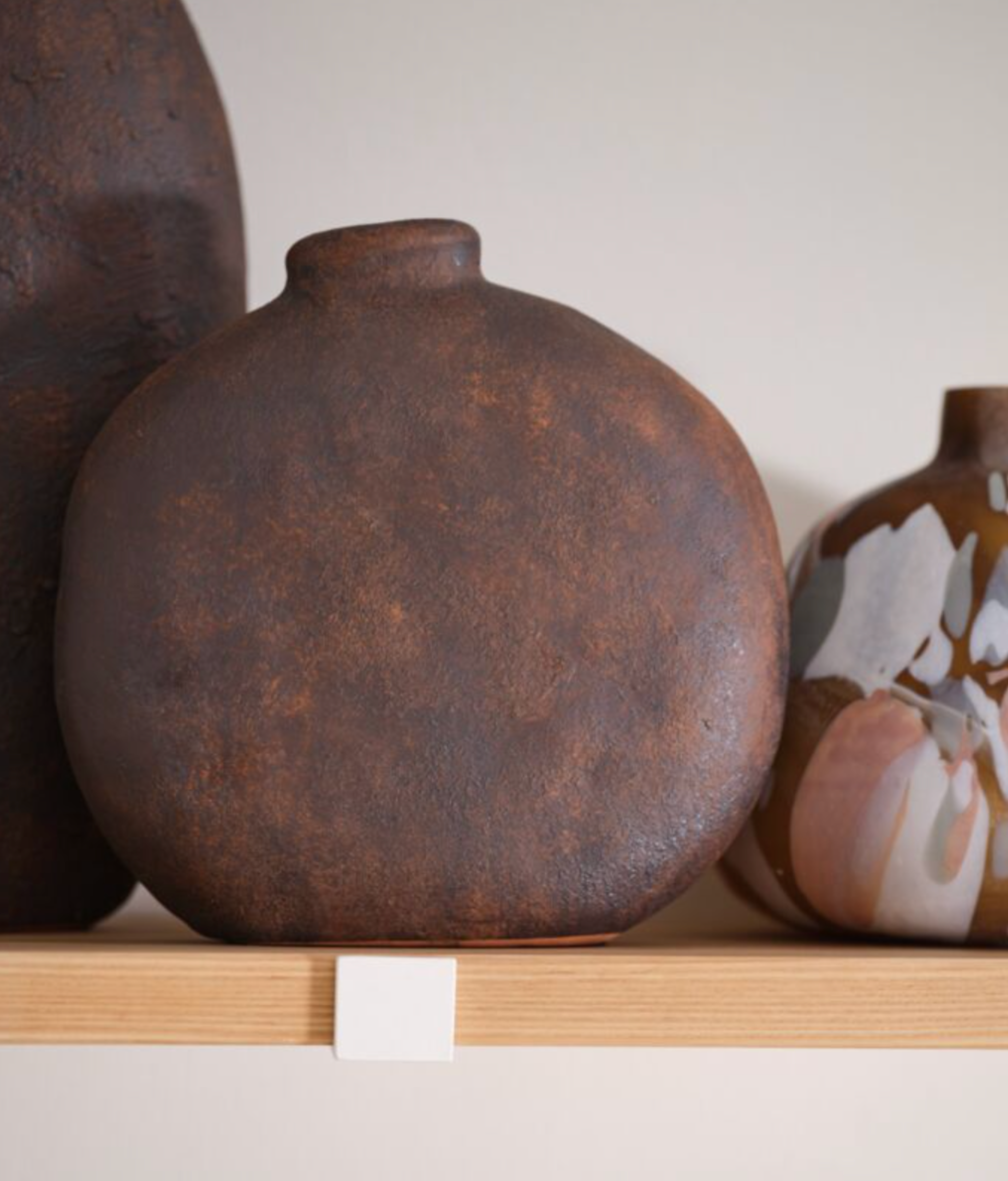 Like something collected from another time & place, the handcrafted Fernando Collection offers an artisanal, antique feel to the home. Featuring a round shape but shallow depth & a bottle shaped opening, these vessels are a stunning addition to a styled console, shelves, or the floor, layered among other aged or neutral vessels.