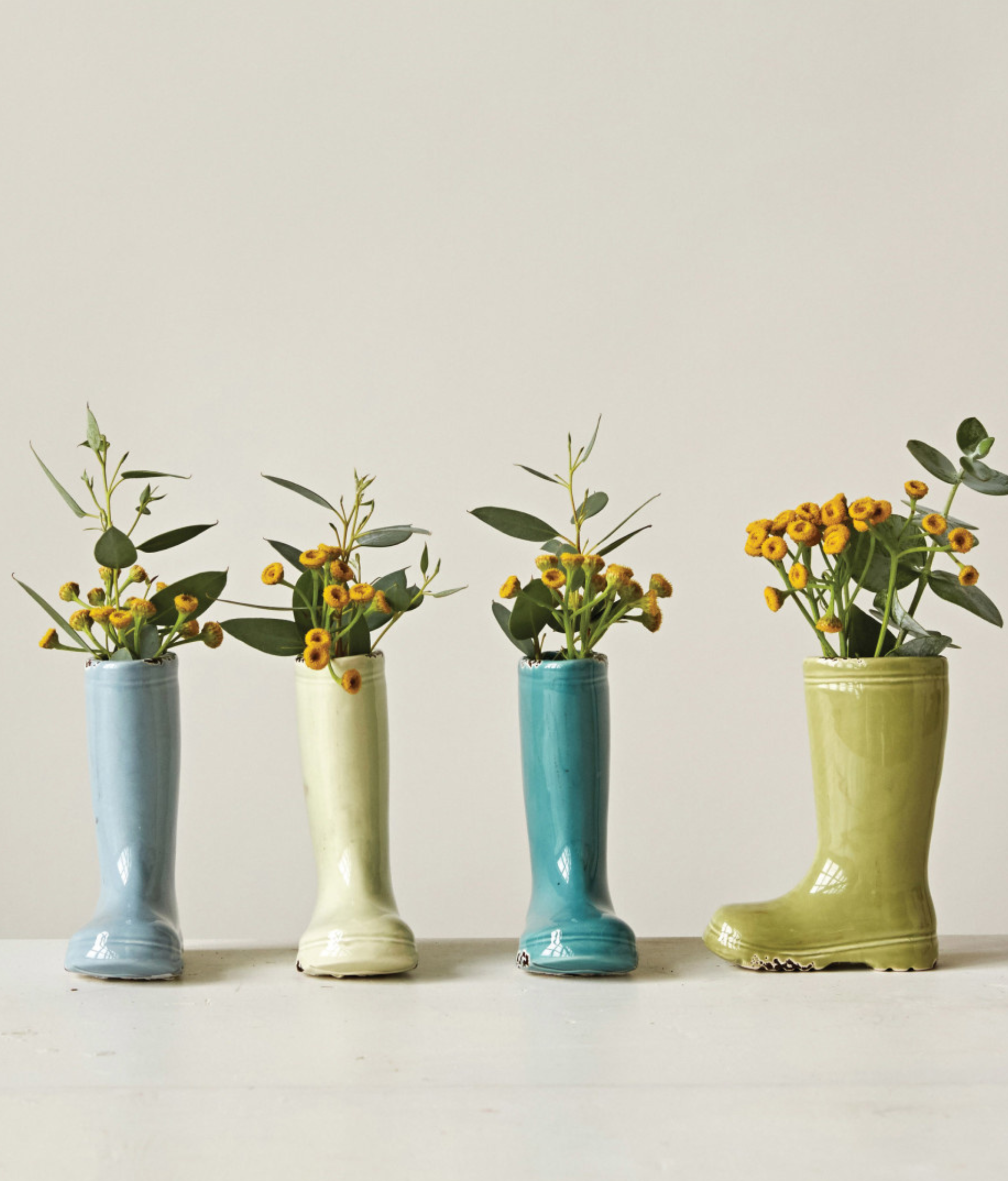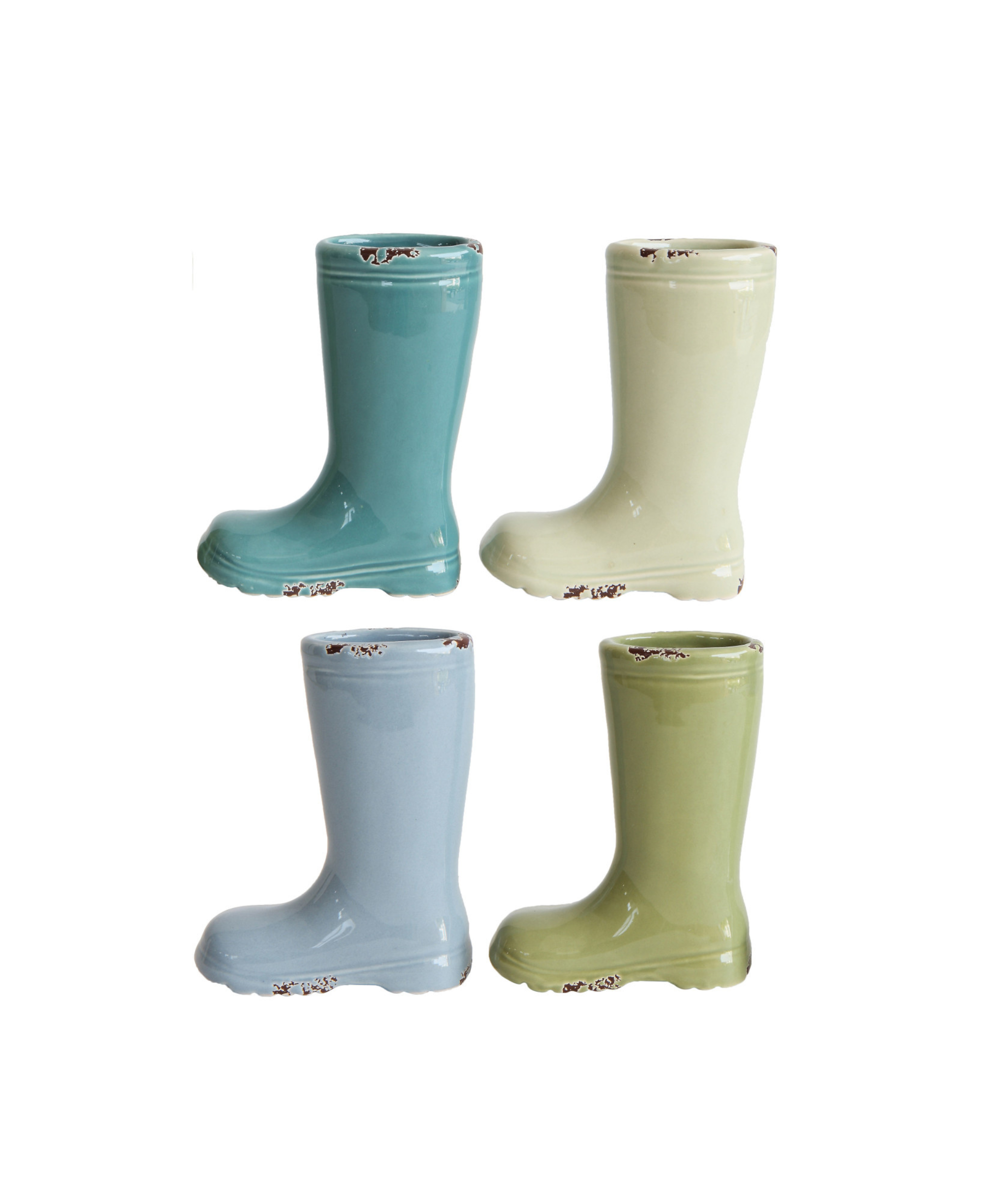 Have fun arranging these boots in a row, with all heels touching or side by side. Fill each with a small flower and scatter mini decorative umbrellas around them for a beautiful centerpiece. They can also be used on a desk to hold pens, pencils and scissors.