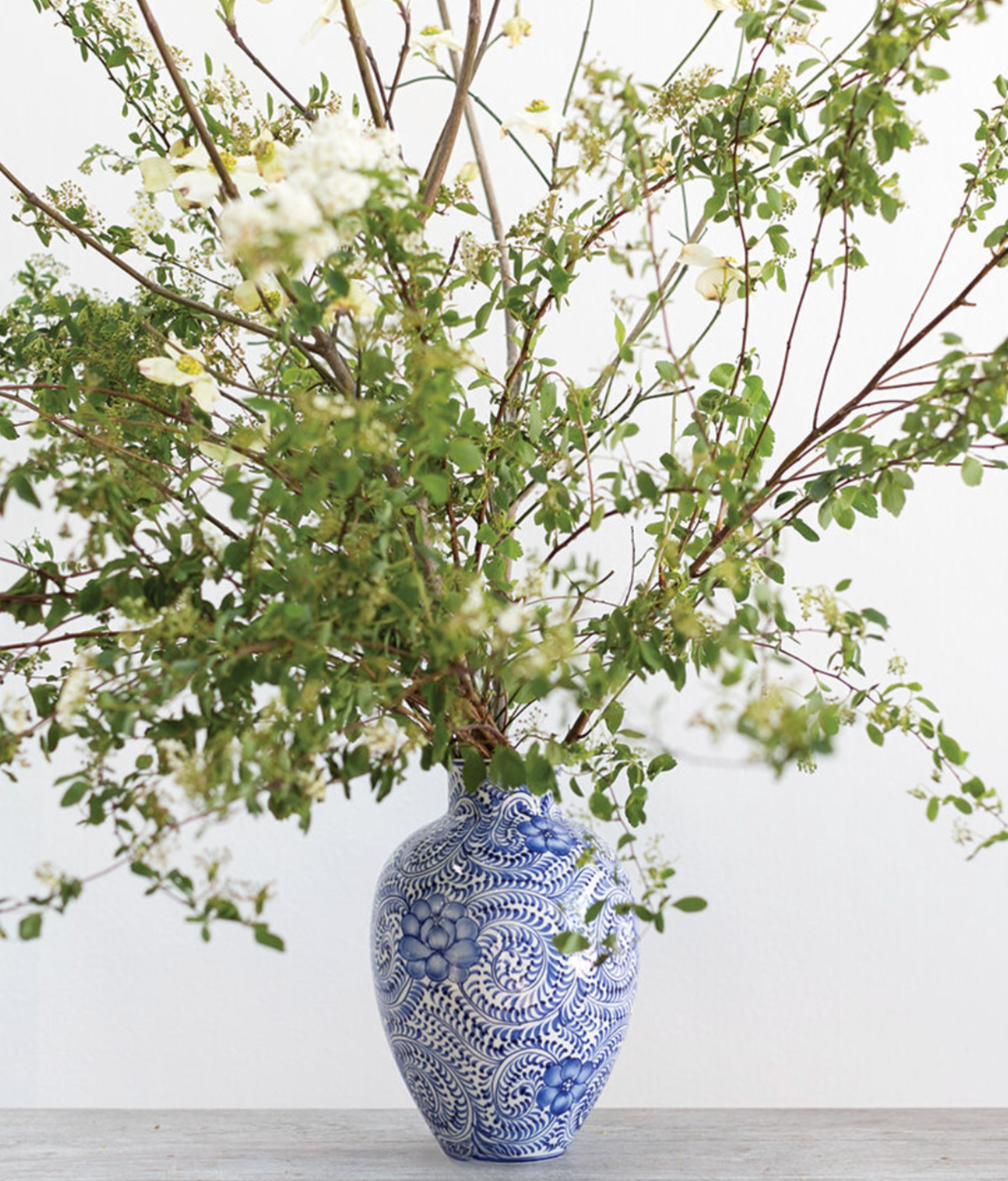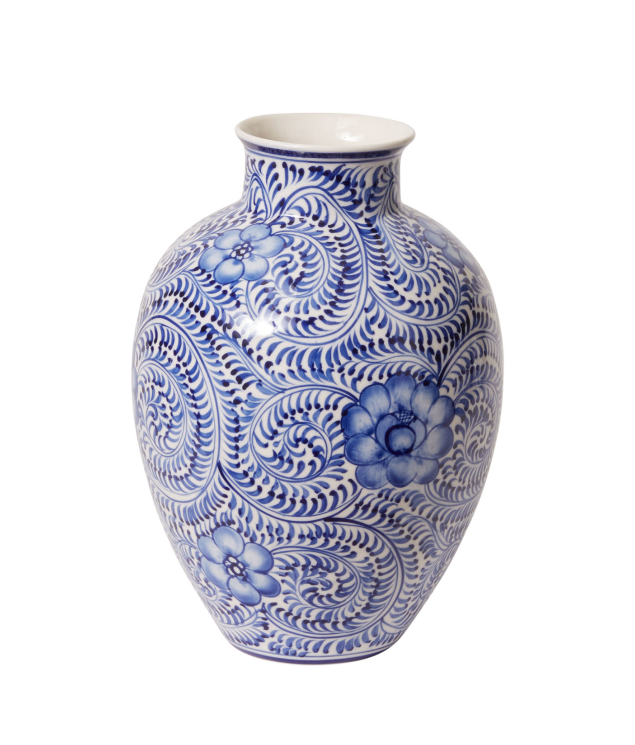 A modern, functional take on classic chinoiserie, the intricately hand painted Eleanor Vase is a seamless blend of old & new with elegant blue floral patterns on white stoneware. With a white background, this piece layers beautifully with more saturated vessels in the Eleanor collection. Made with the floral designer in mind with a tapered neck & flared opening that's ideal for arranging, this on-trend vase provides a vintage sensibility to wedding or event design.
