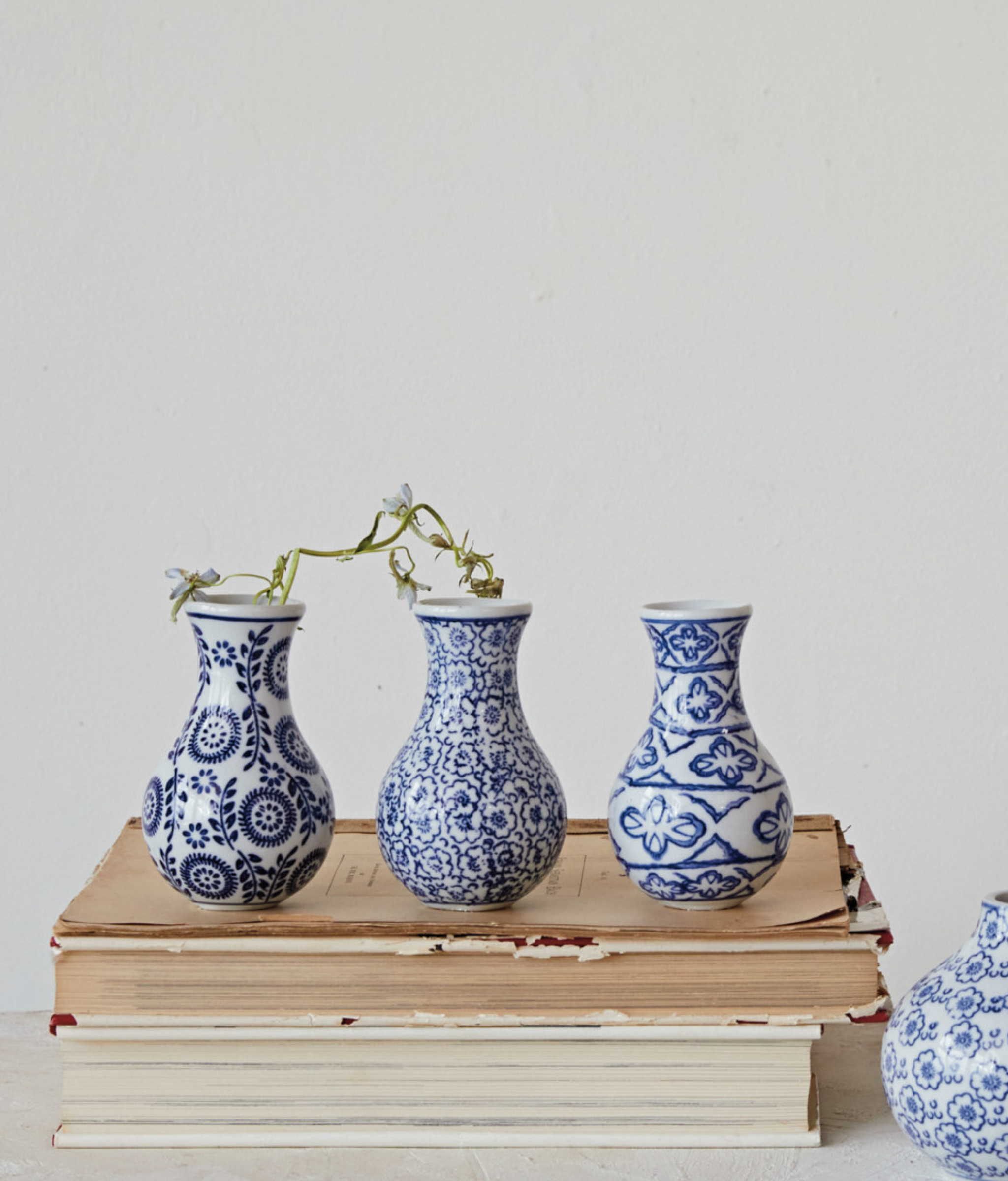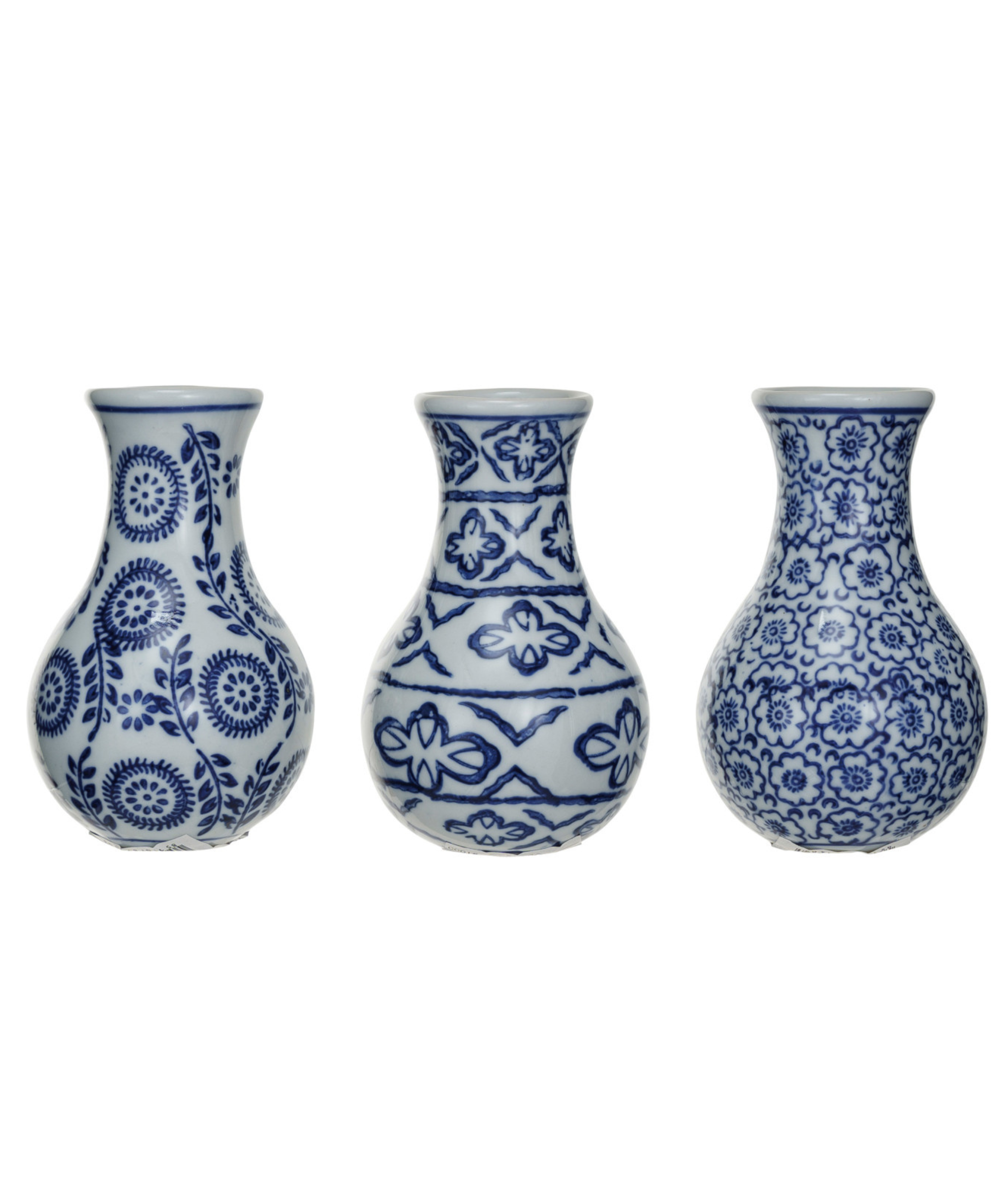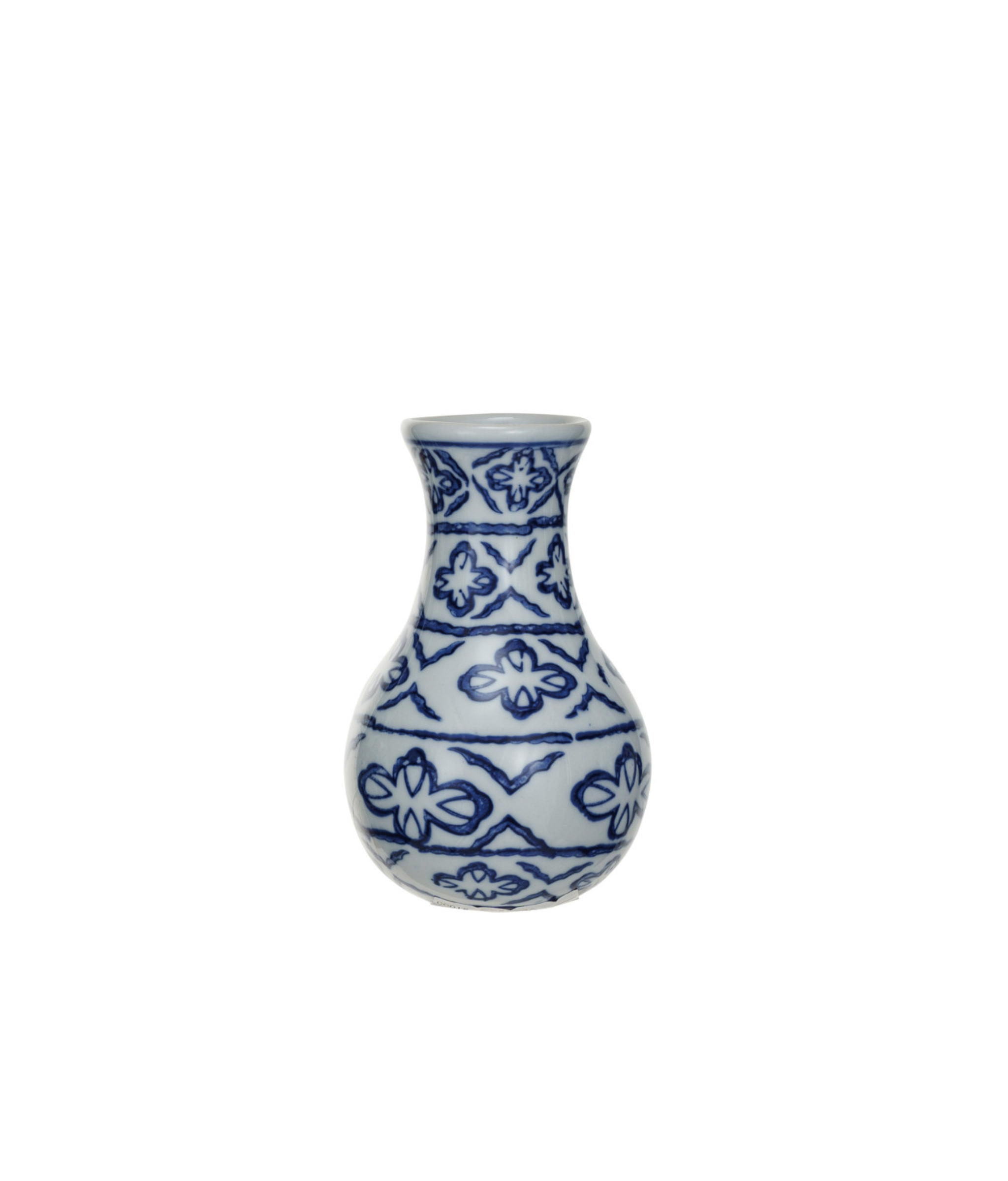 Crafted from durable, high-fired stoneware, the vase features a graceful, rounded silhouette with a subtly flared neck. The exterior is adorned with an intricate, hand-stamped pattern of stylized floral motifs and trailing vines in a rich cobalt blue against a crisp white background. This attention to detail ensures that each vase is a unique statement piece of enduring beauty.