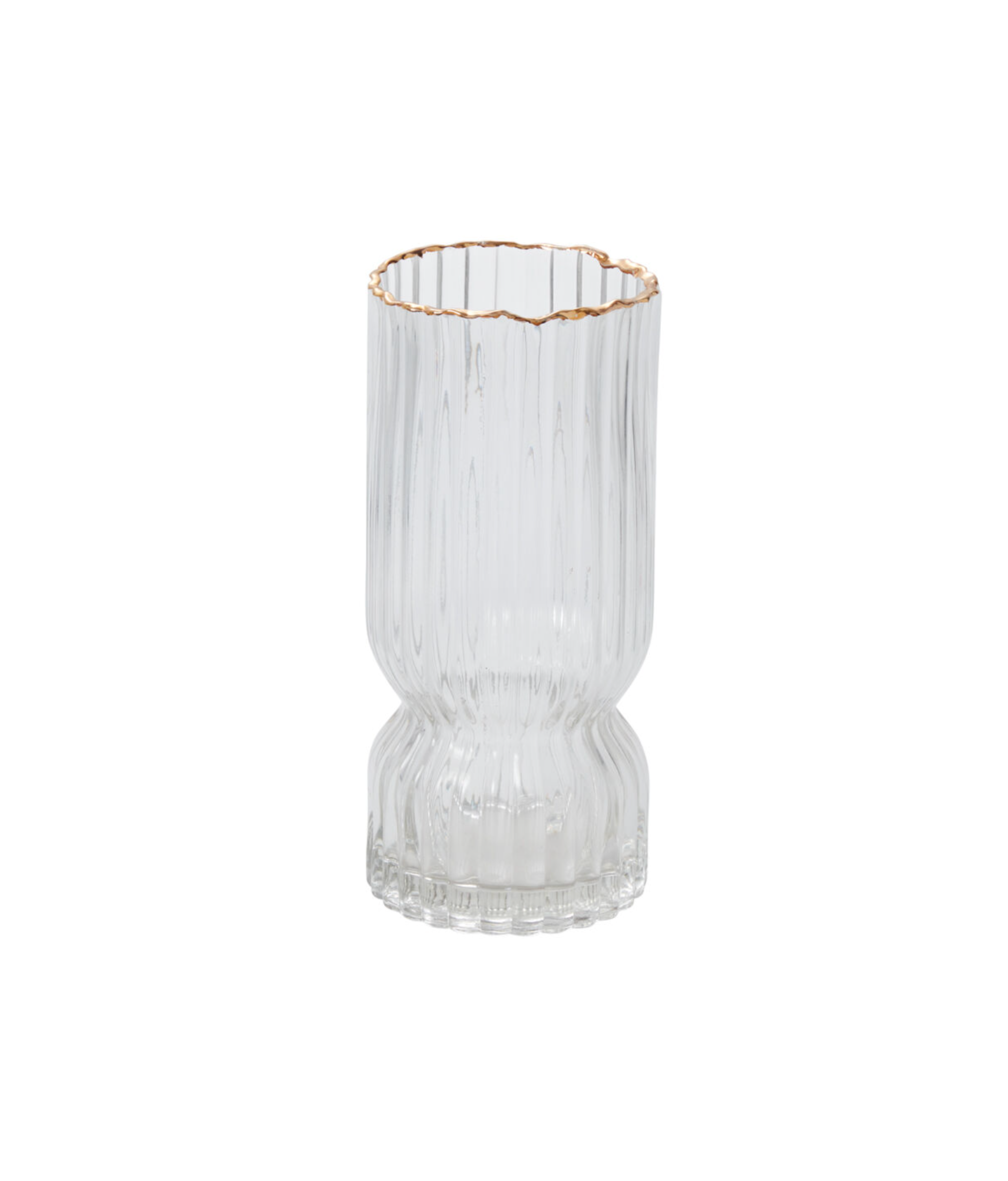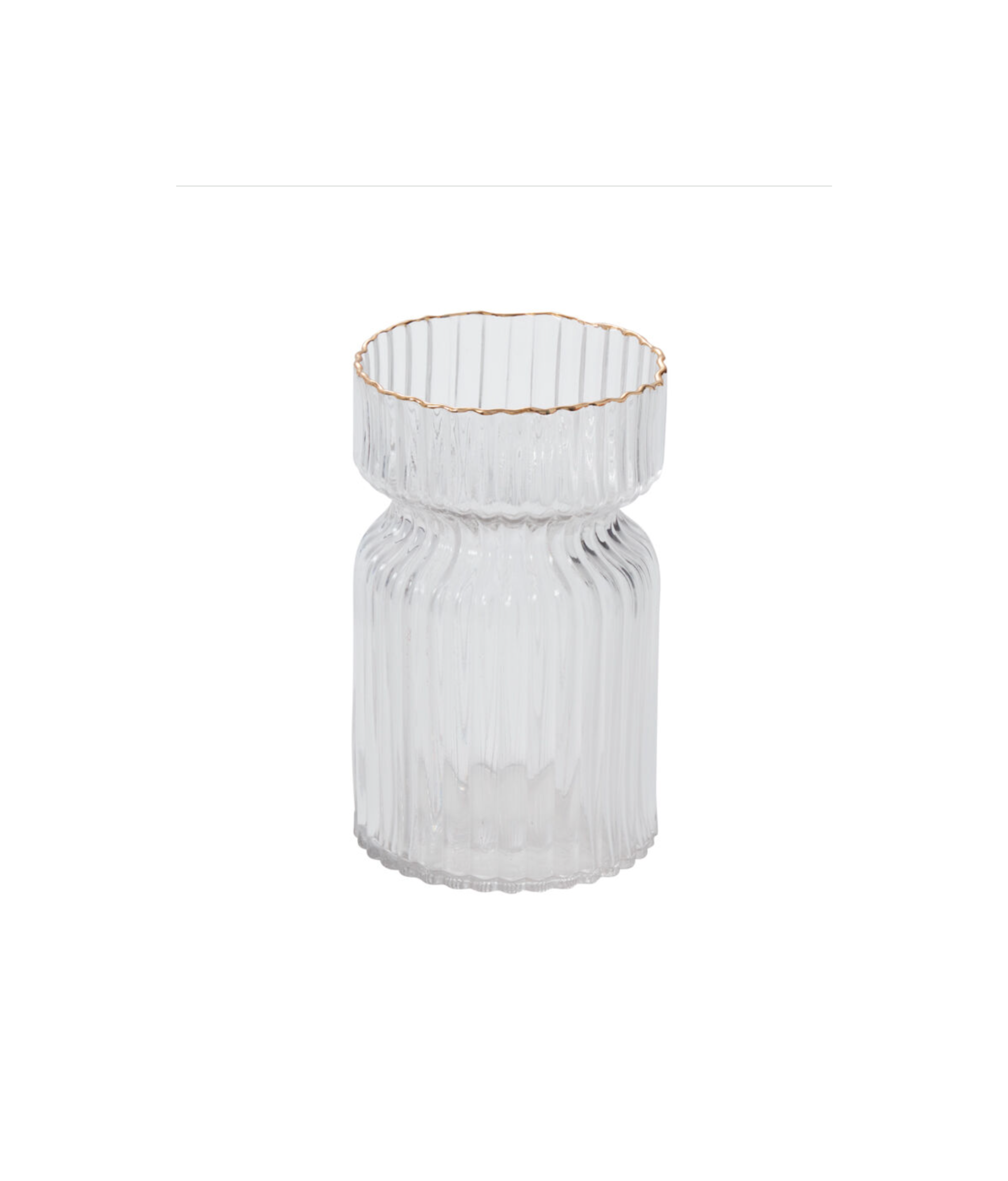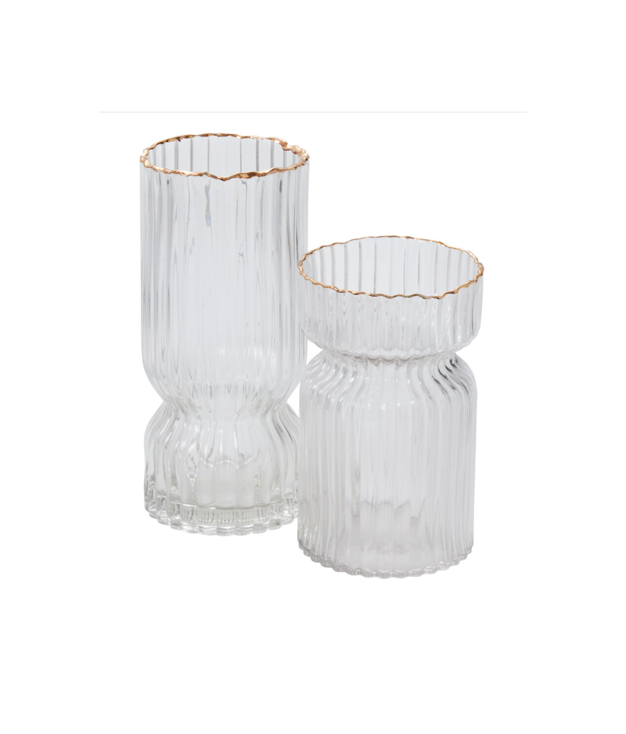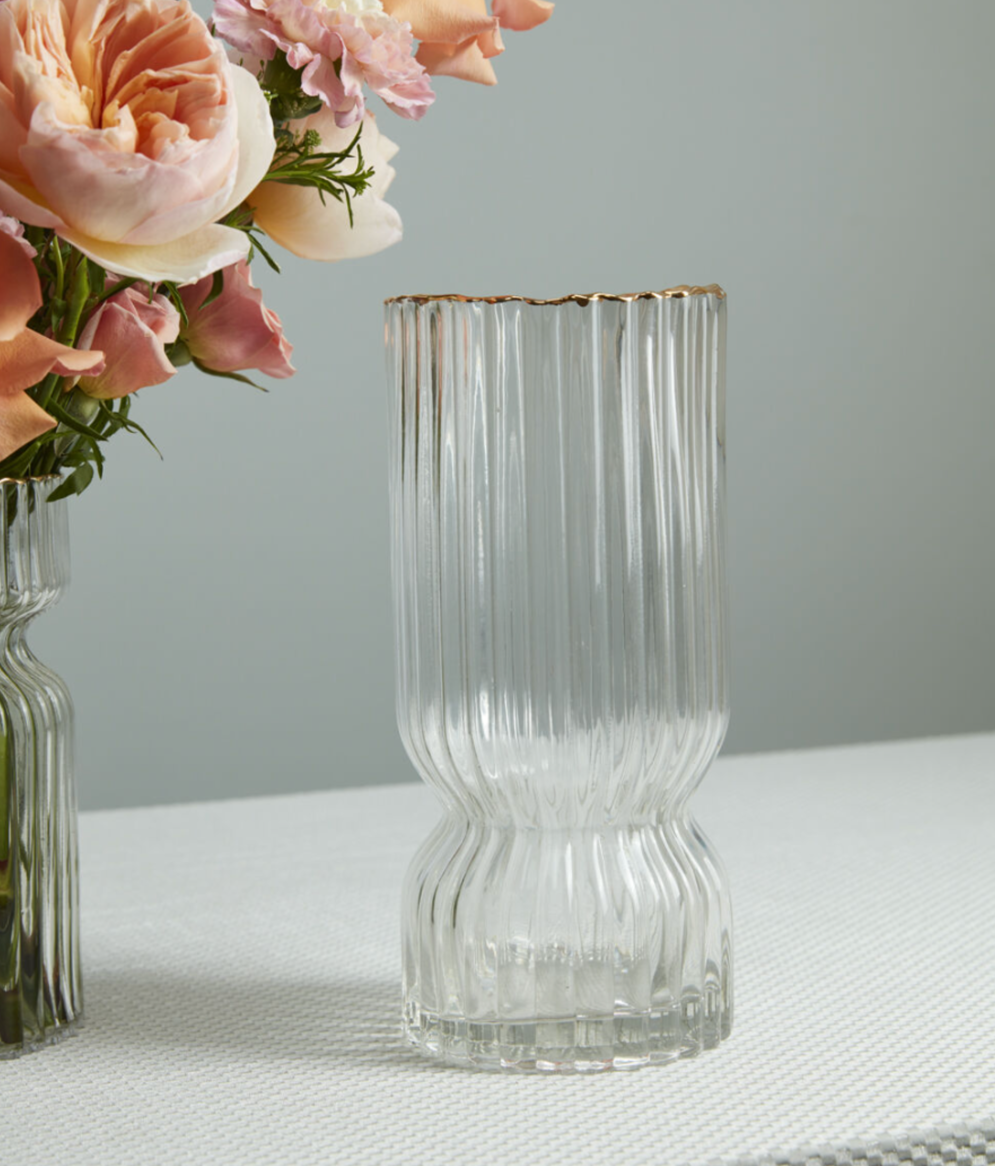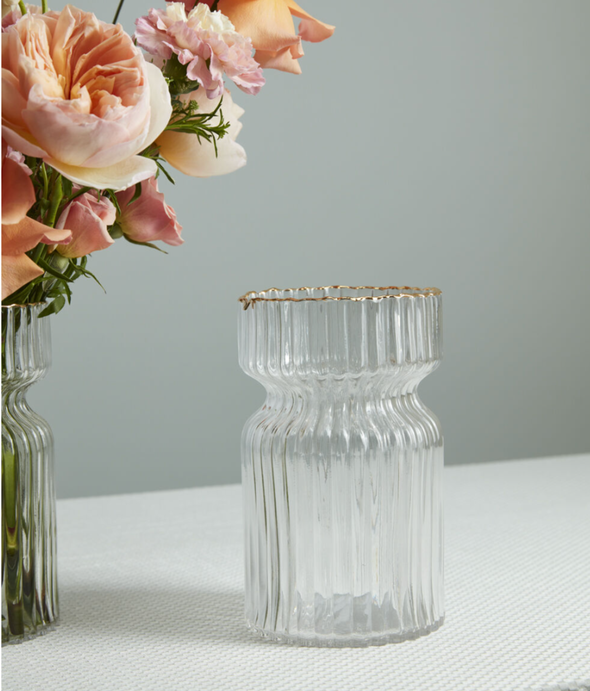 Set the table with elegance & sophistication with the Glass Odette Vase, featuring a ribbed texture, cinched neck, & an exquisite gold metallic rim. Made from lightweight, textured glass, this cylindrical vase is a modern take on classic design that effortlessly complements everyday decor or special events, filled with any style of florals.