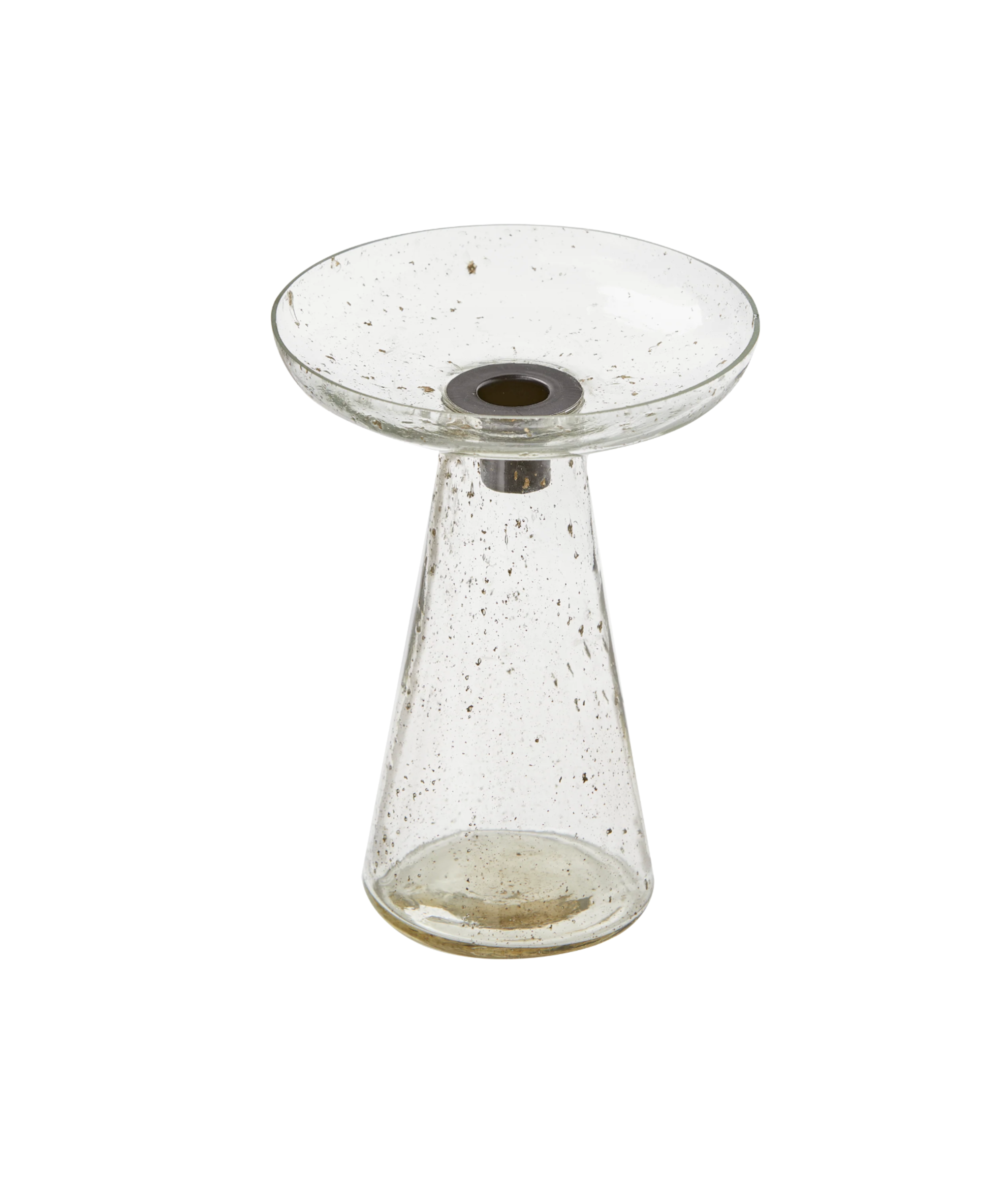 Beautiful, hand-crafted taper candle holder made from clear recycled glass and metal.