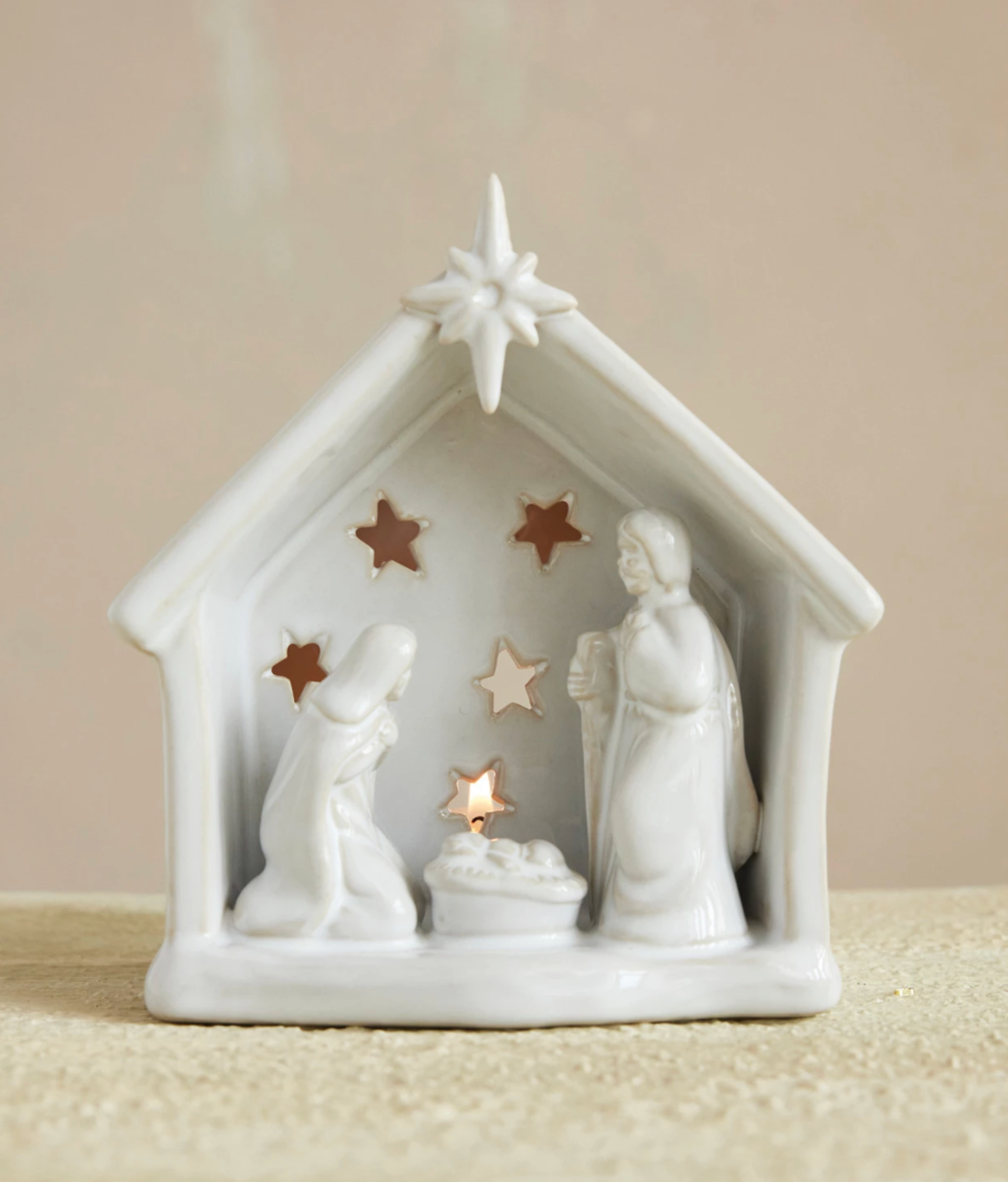 Celebrate the season with timeless grace. This porcelain nativity scene features a serene depiction of Mary, Joseph, and baby Jesus beneath a softly arched stable roof. Delicately sculpted with fine detail, the design is enhanced by star-shaped cutouts that glow warmly when a tealight is placed behind the scene—casting a soft, ambient light through the ceramic.