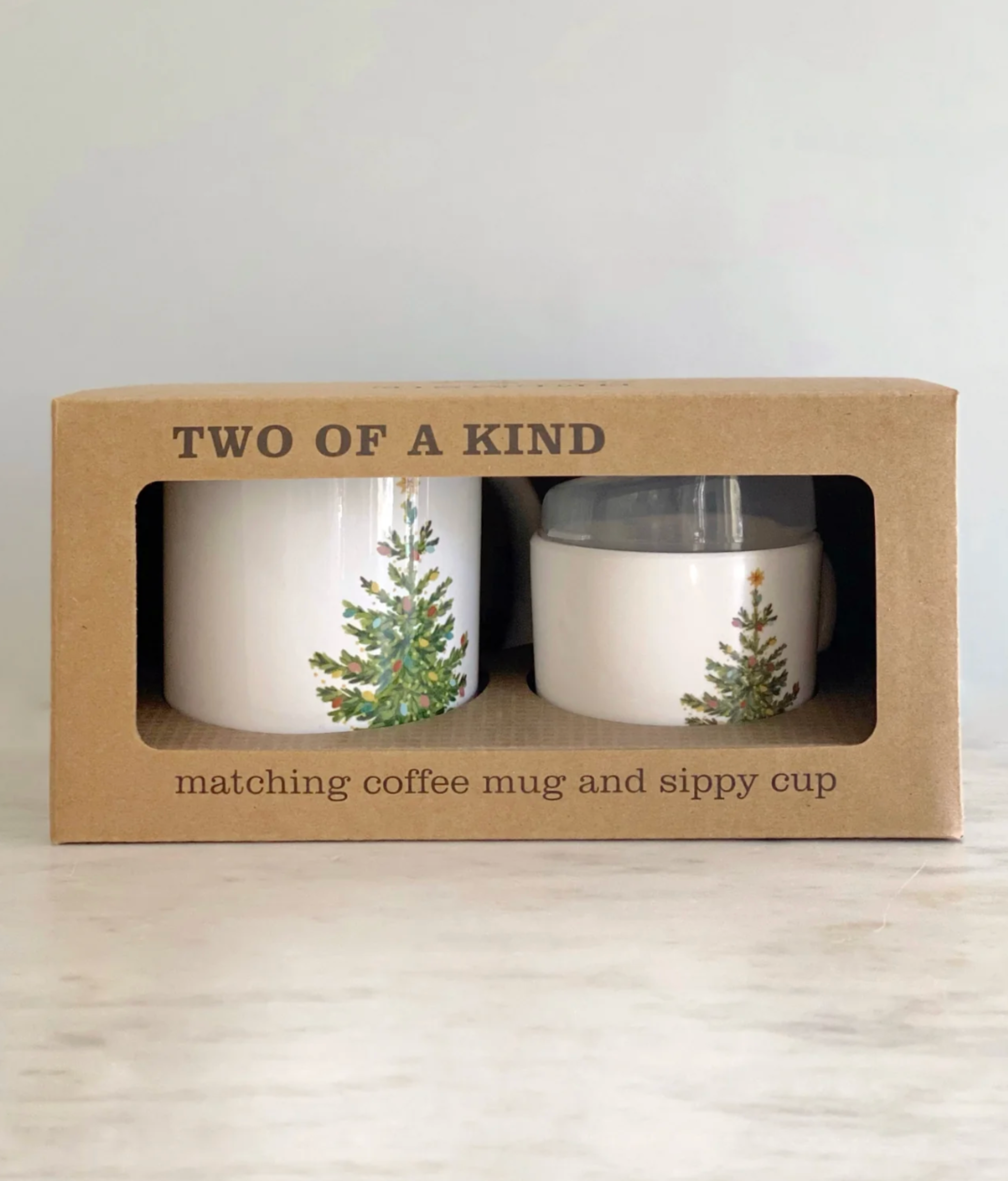 Celebrate the holiday season and sip some hot chocolate with our newest Two of a Kind cup set! Coordinating mug for Dad, Mama (or anyone really!) and sippy cup for babe featuring a classic and nostalgic Christmas tree in a basket.