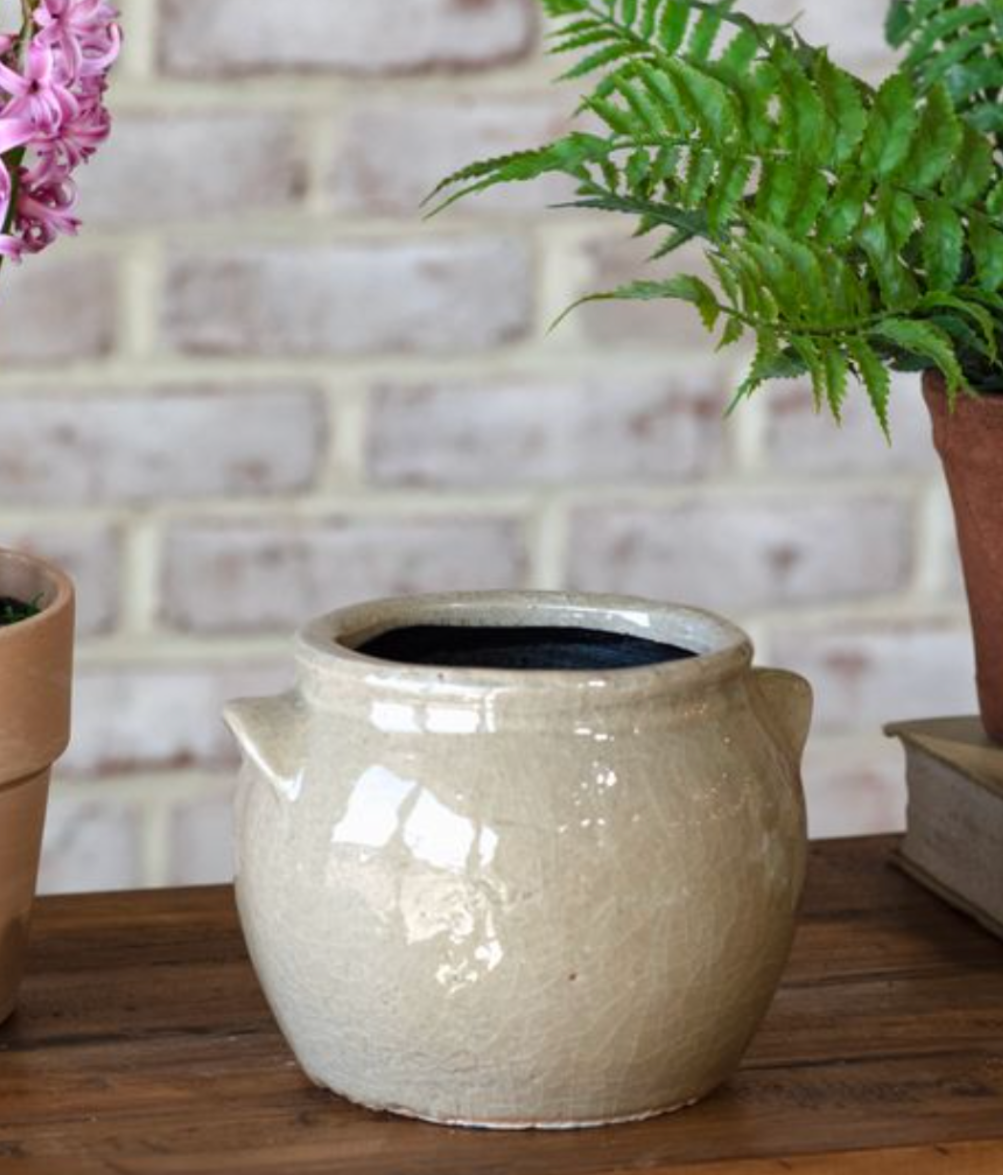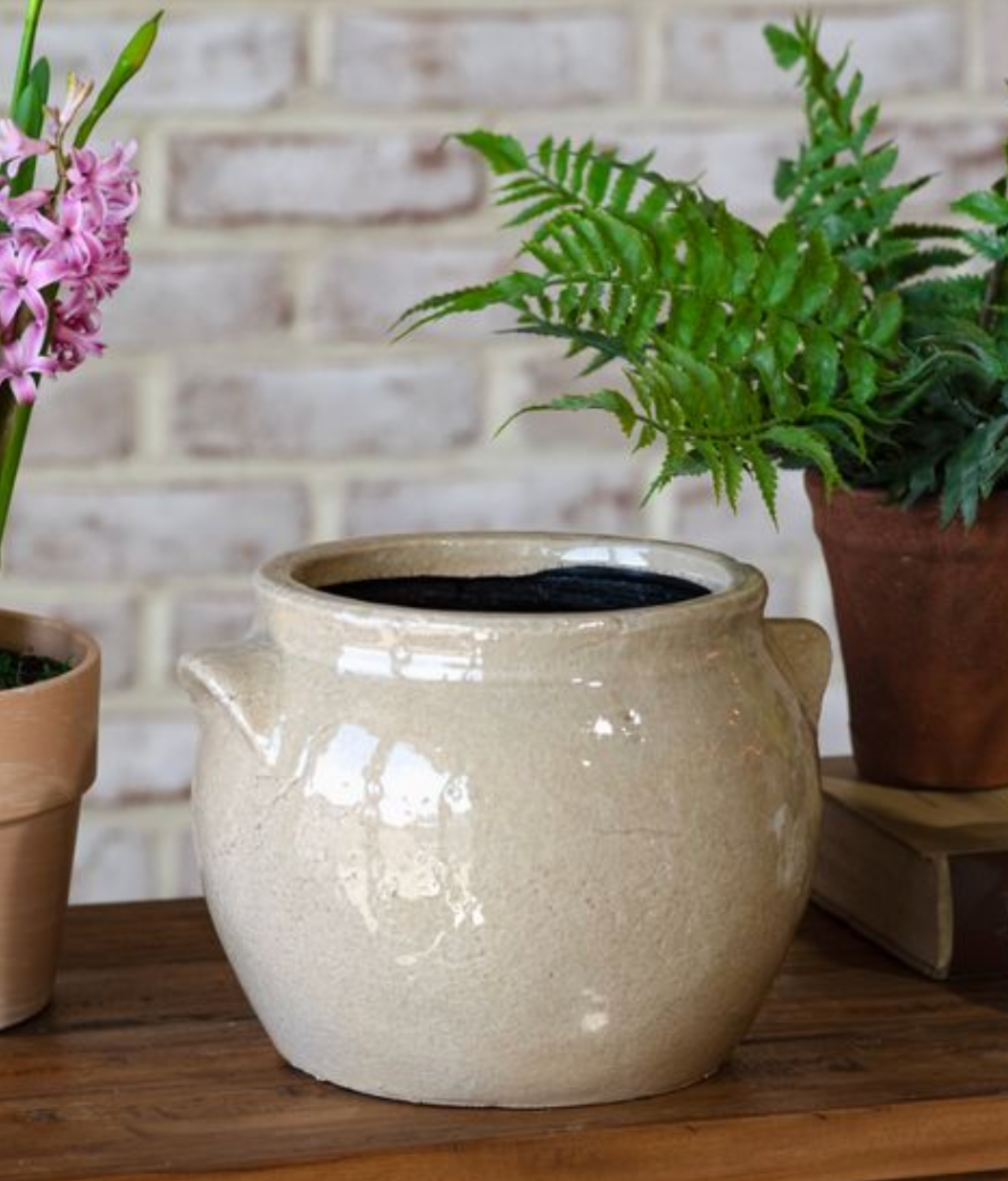 Introduce a touch of timeless, rustic charm to your interior styling with this beautiful ceramic crock planter. Crafted from durable stoneware in a soft, light beige finish, the piece features a classic, subtly bulbous shape and two small, distinctive side handles.