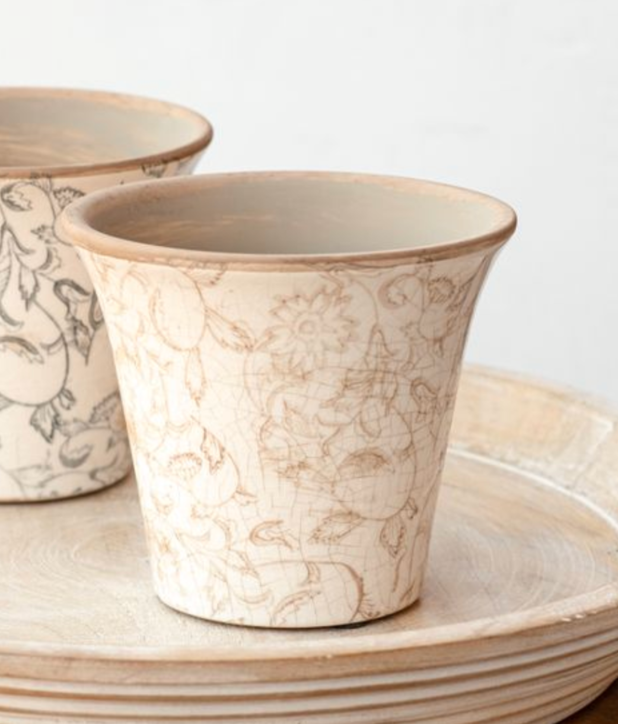 This refined ceramic planter brings an artful, collected feel to any interior. Crafted in a warm ivory glaze with delicate, hand-drawn botanical detailing, each piece has subtle variations that highlight its artisanal nature. The gently flared silhouette offers a graceful profile, while the softly finished rim adds a tactile, elevated touch.