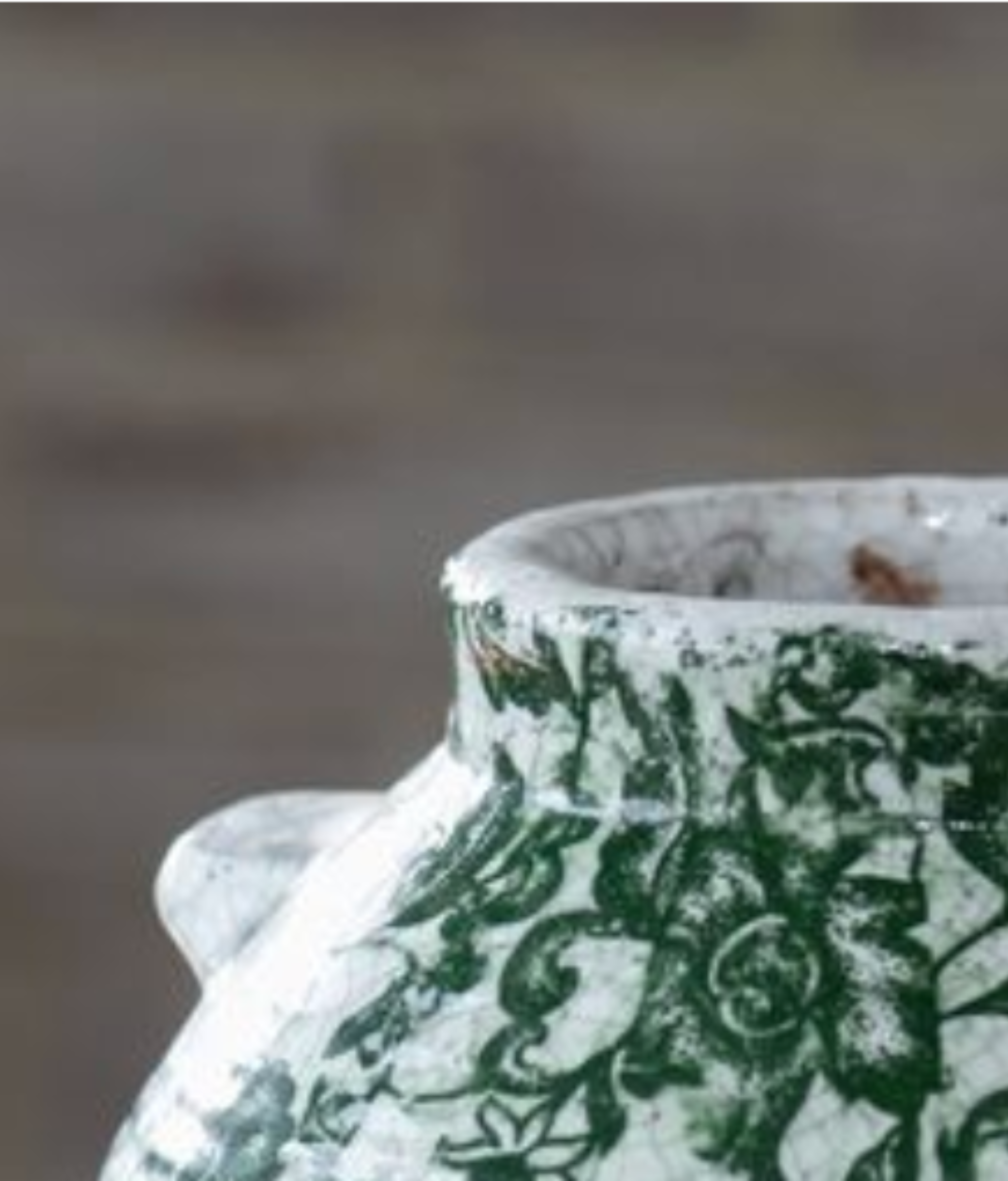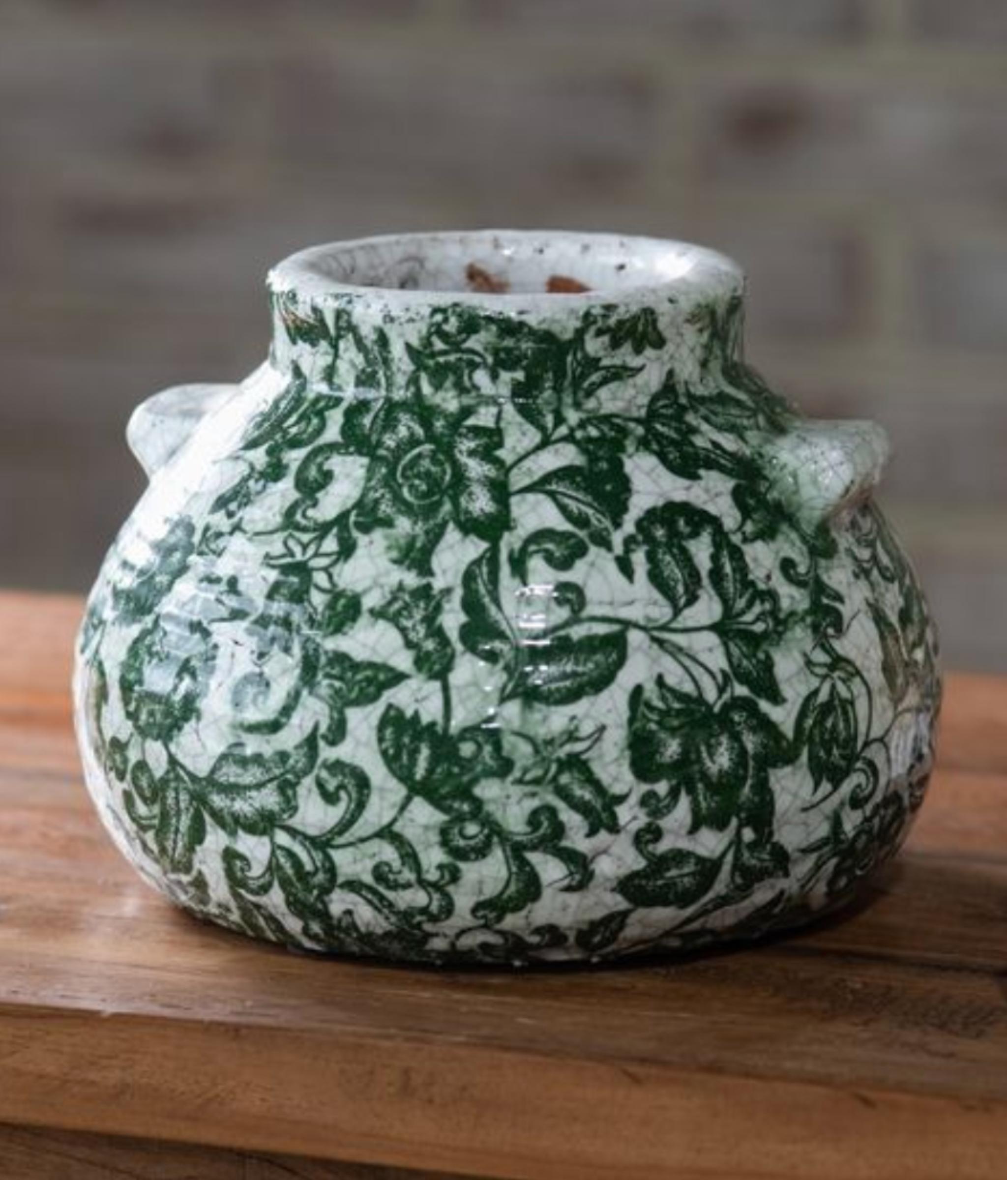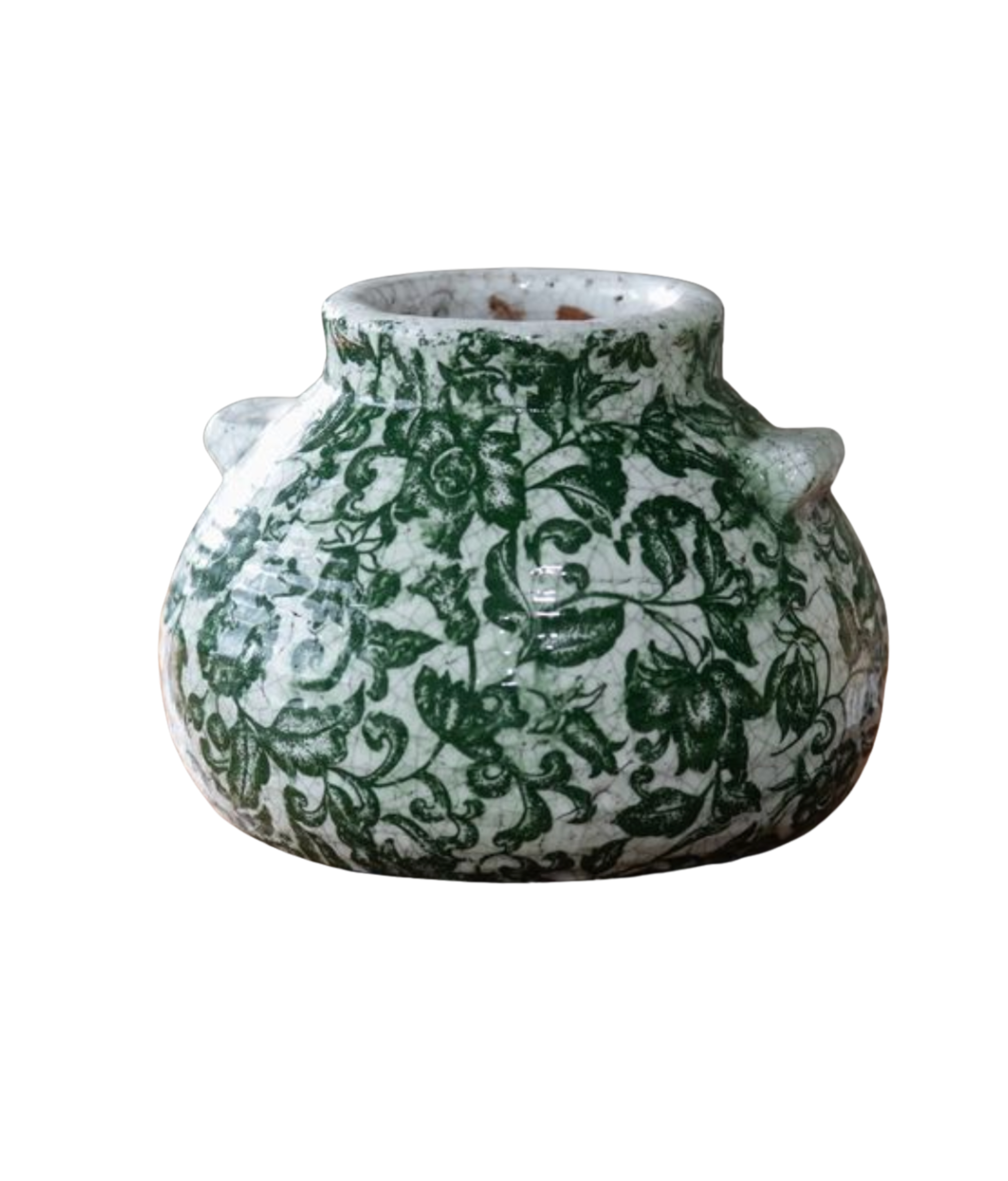 he distinctive, nature-inspired design features a detailed scroll and leaf pattern that evokes a sense of serene, organic charm. Its unique, squat silhouette and subtle side handles offer a sophisticated, rustic elegance that complements both modern and traditional decor schemes, including French Country or Chinoiserie styles.