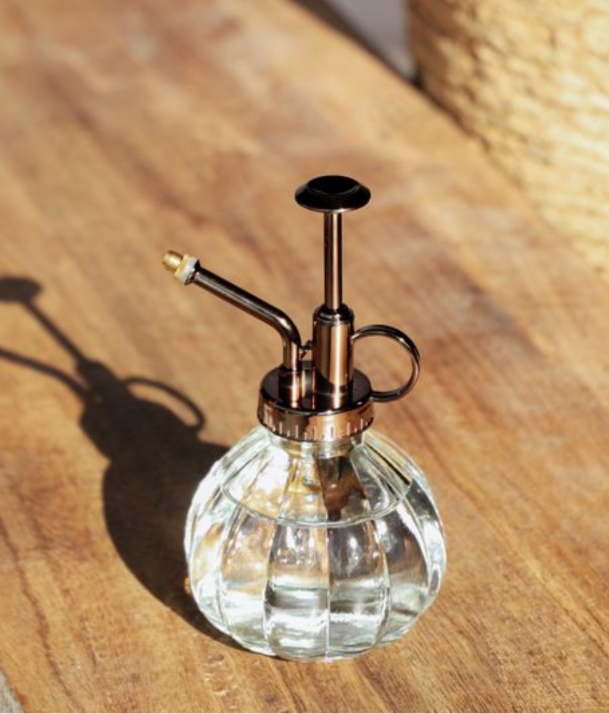 This charming and functional plant mister adds a touch of classic elegance to your home gardening routine. The clear, ribbed glass body has a vintage-inspired design, while the top pump and spray nozzle feature a stylish copper-toned metallic finish.
