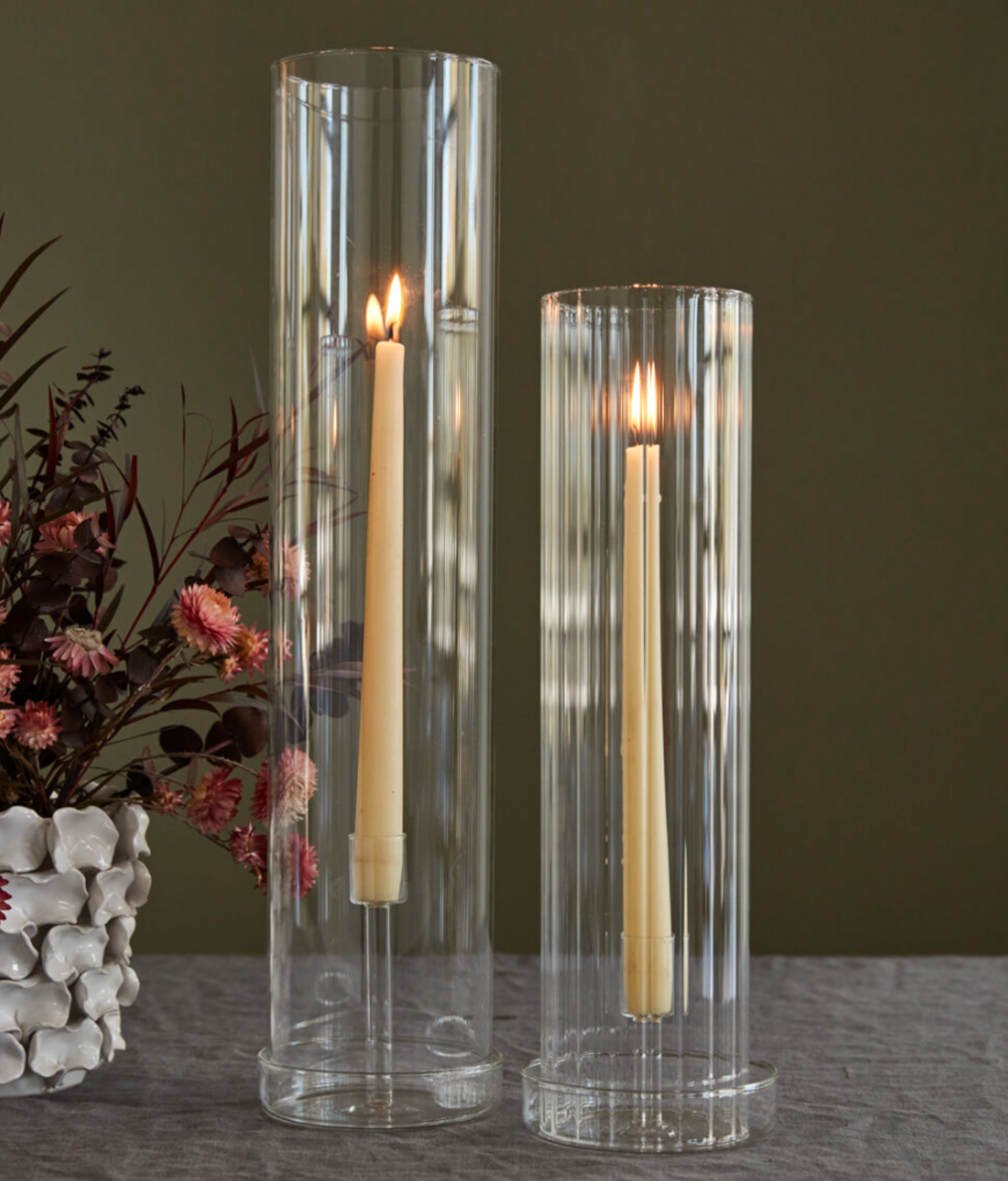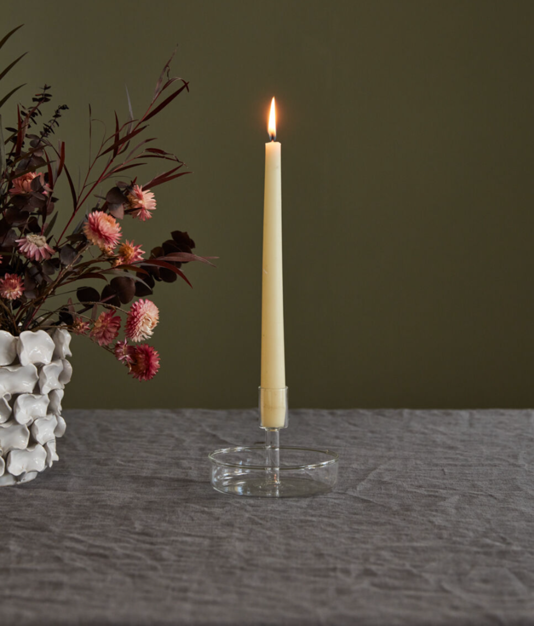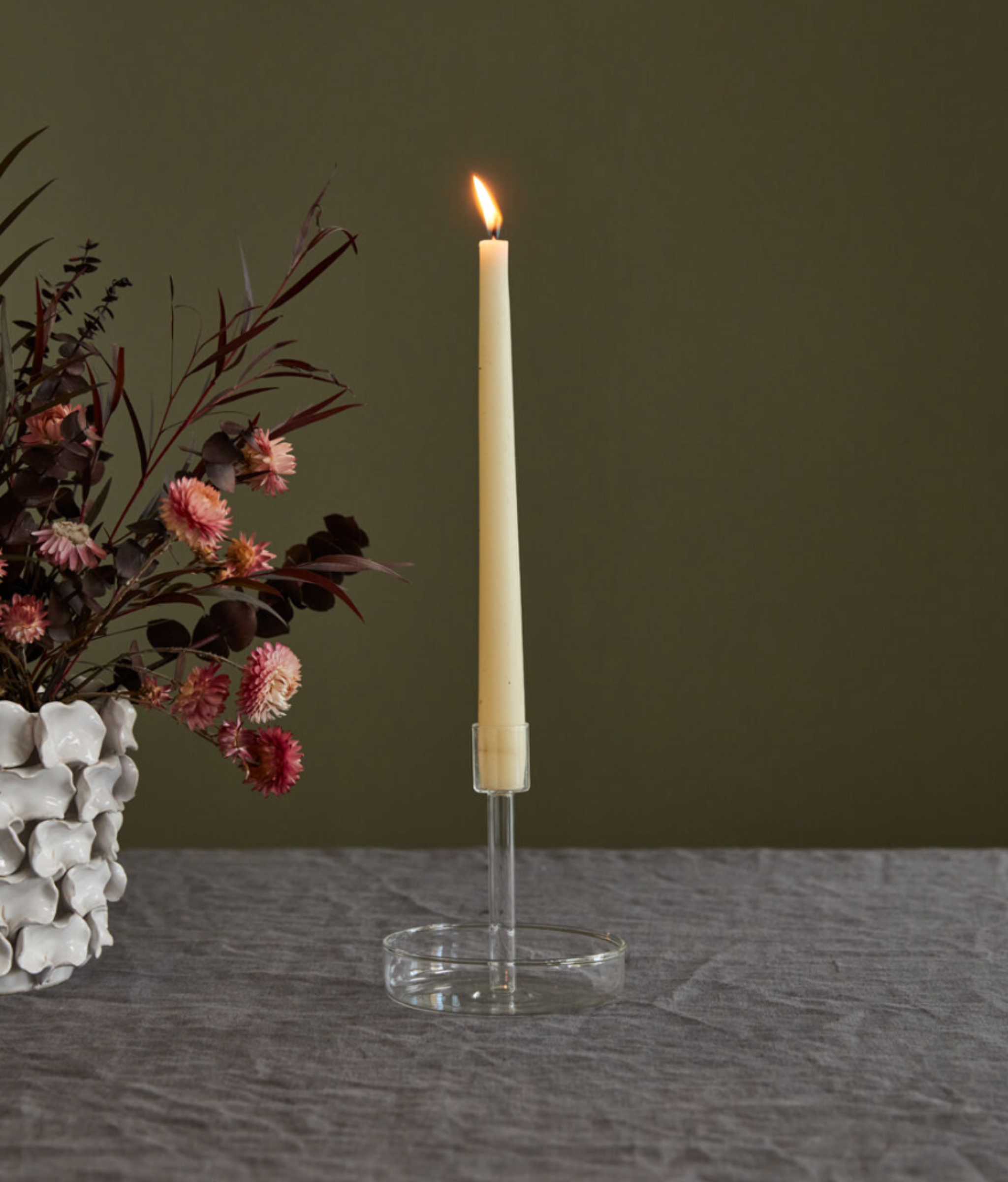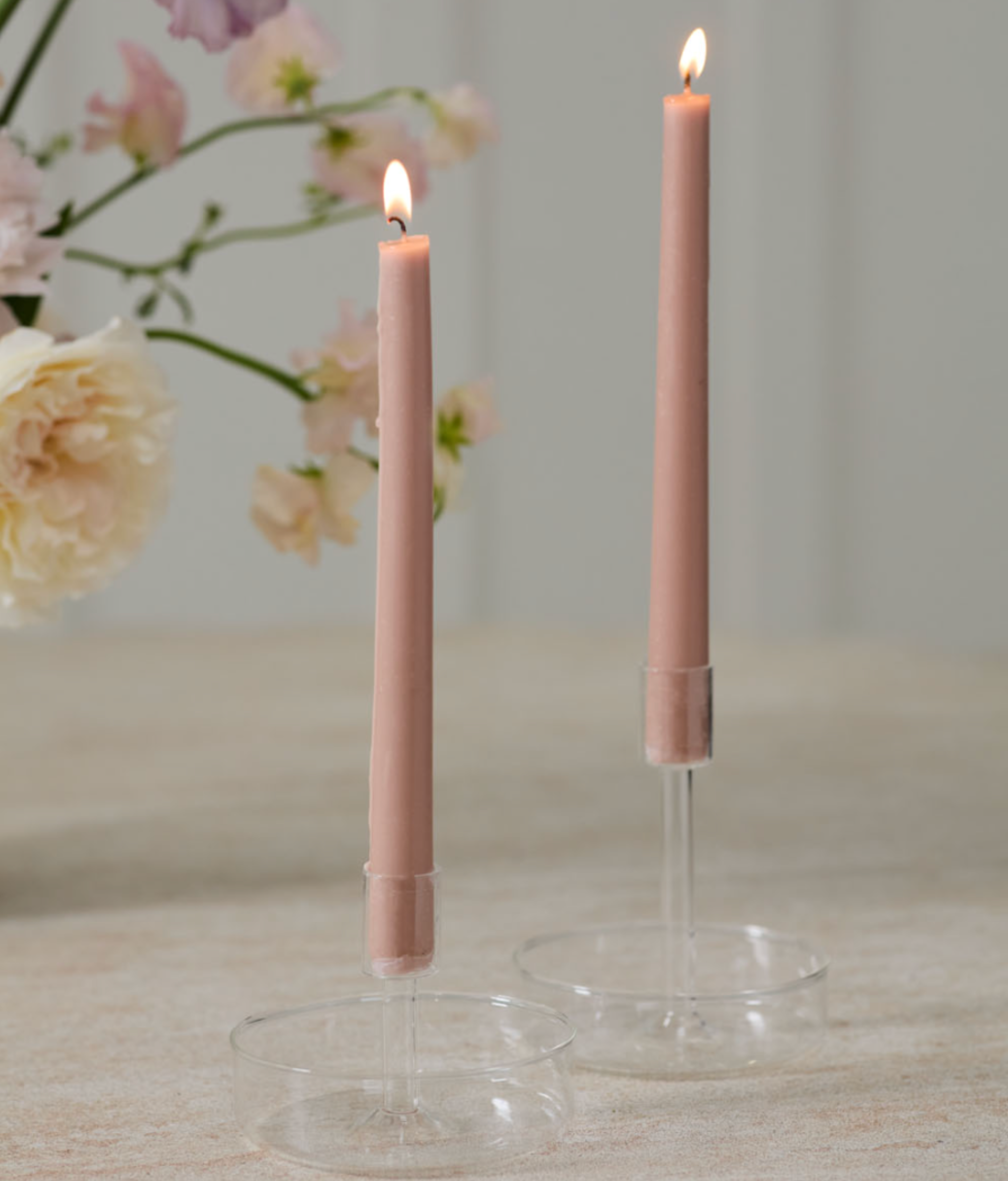 The Adeline Candleholder is a glass taper candleholder with a base to fit our Glass Sleeve. Perfect for making a statement with candlelight at every event and tabletop display.