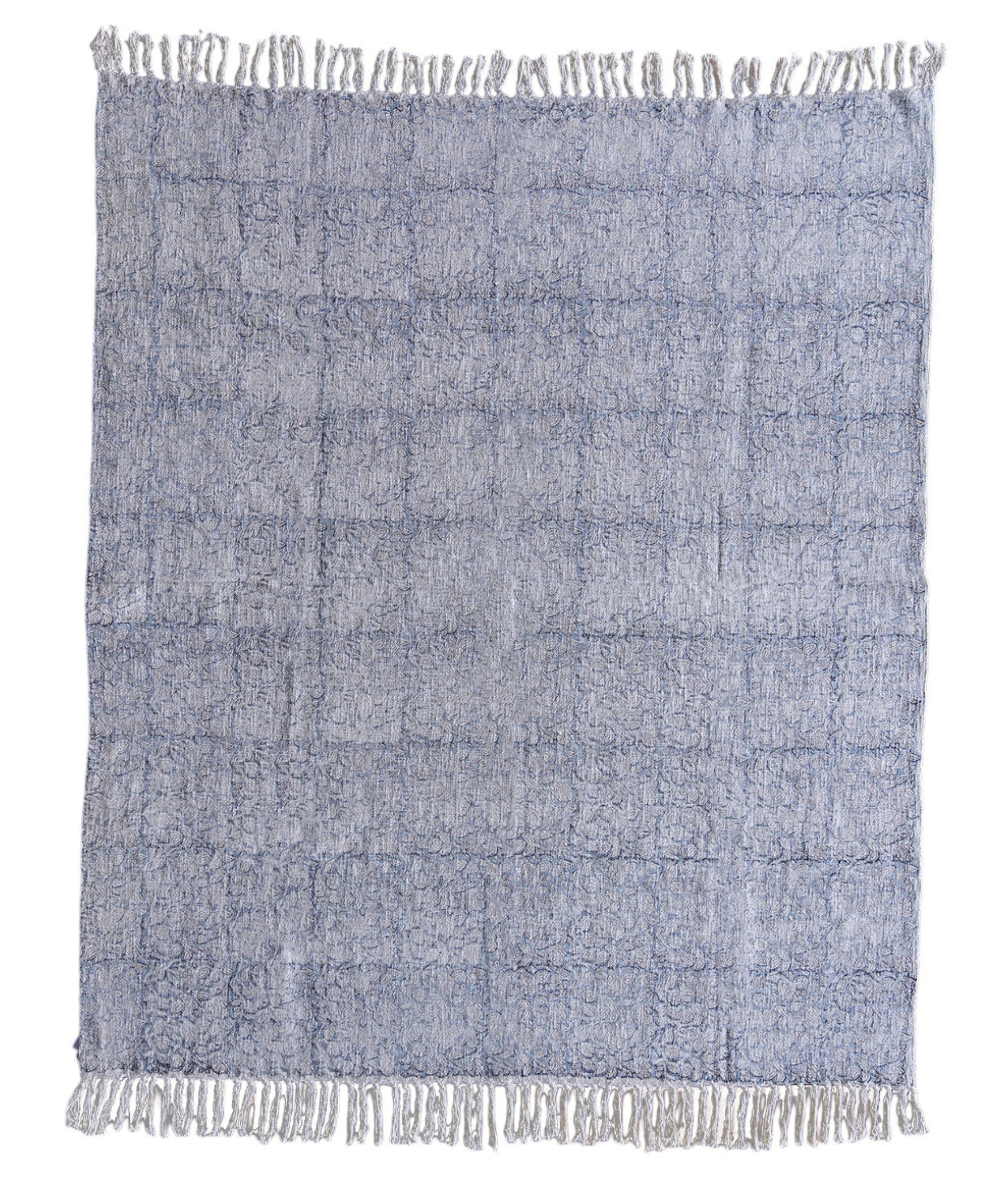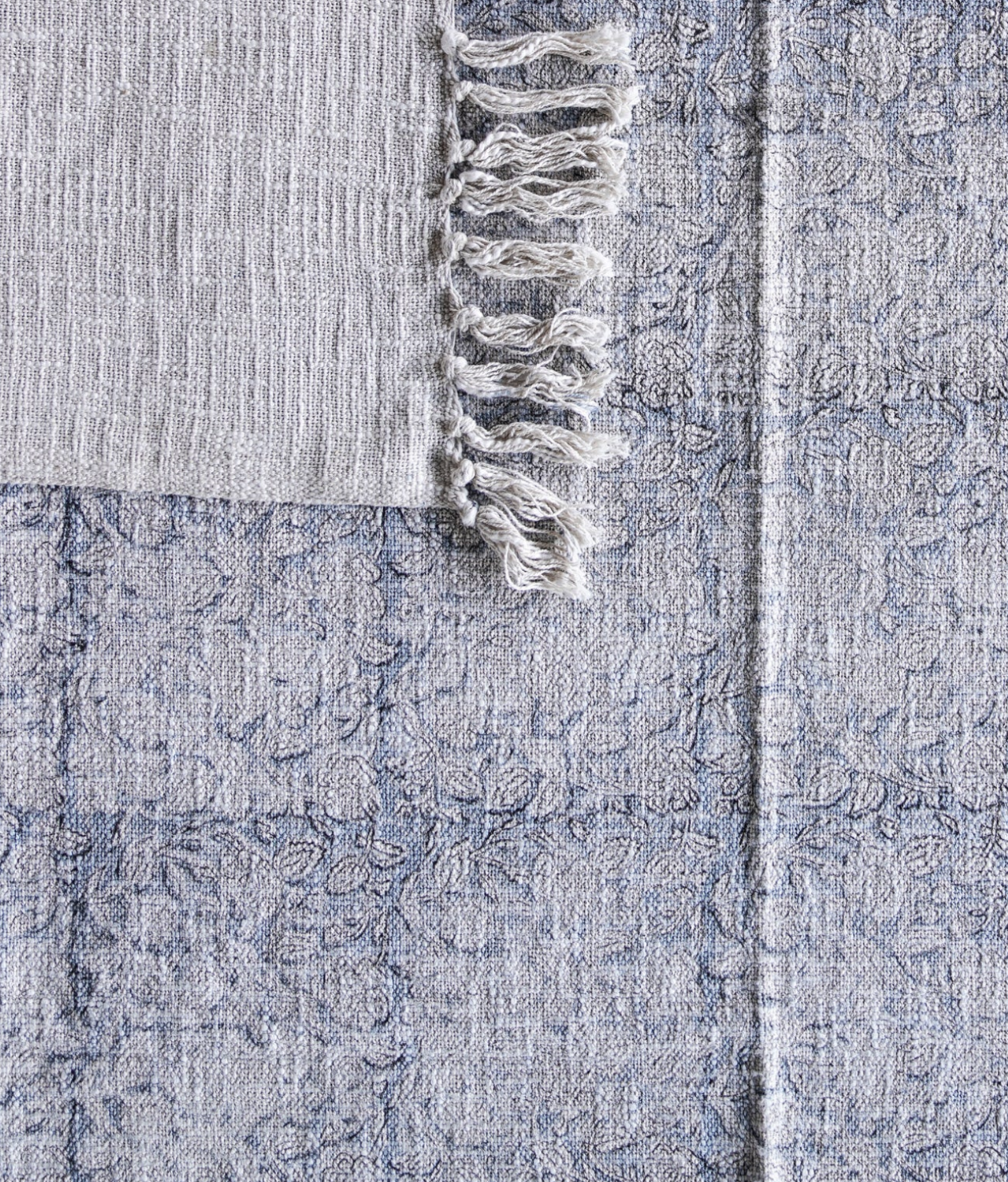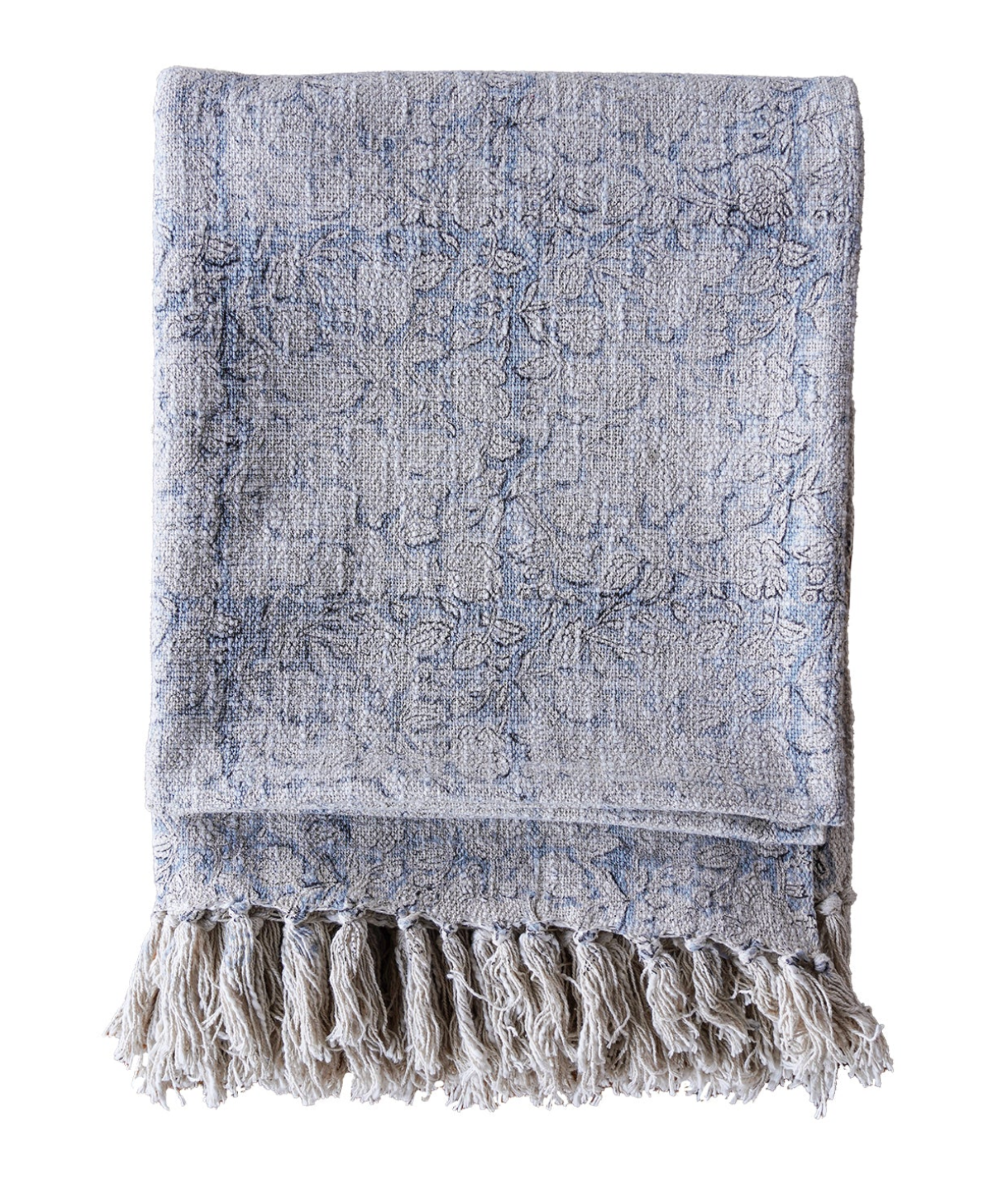 Our Handloom Cotton Throw comes in a delicate floral print that was hand-loomed in block sections that add a subtle geometry to the piece. Each rectangular throw is edged with fringe on the short side.