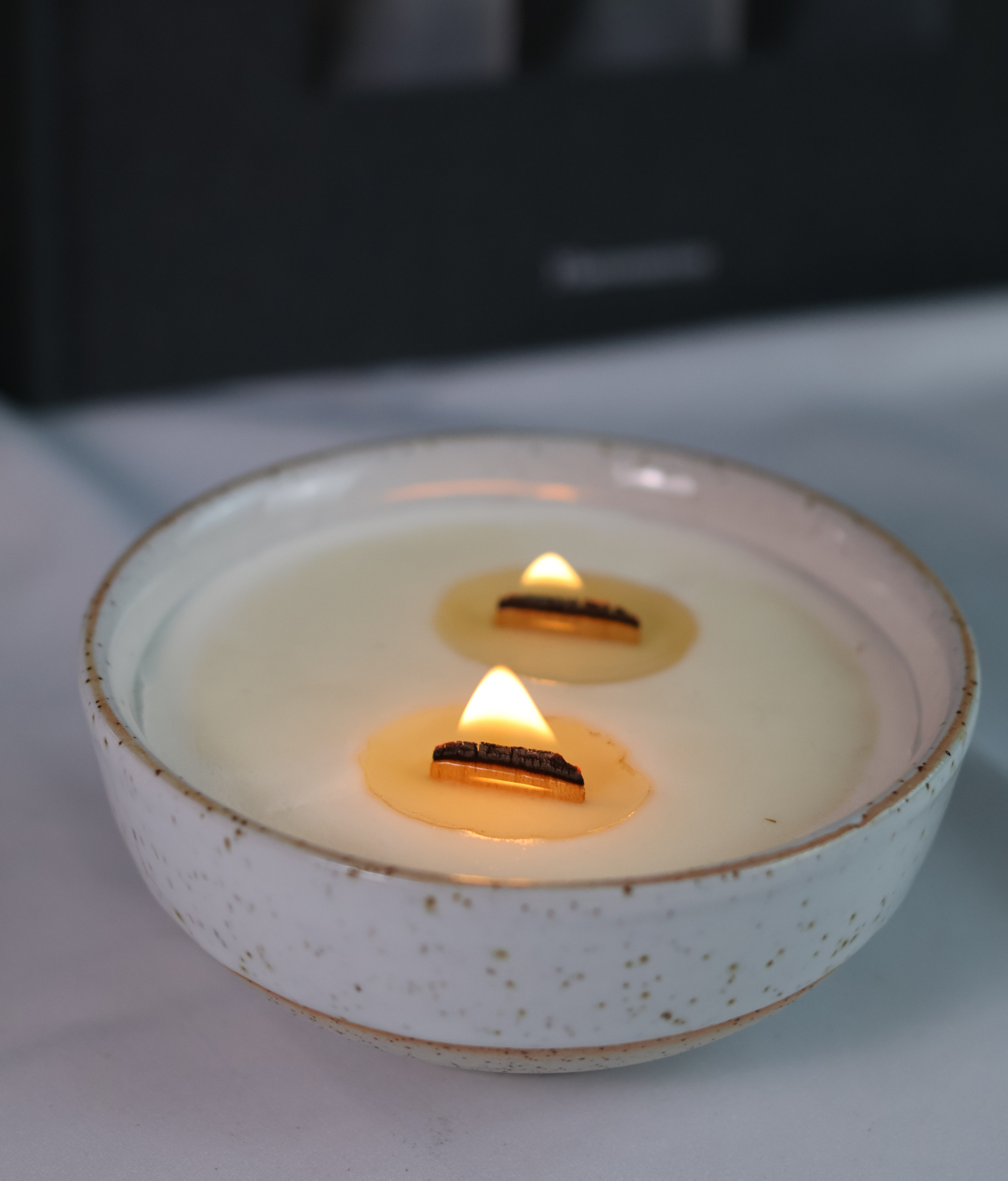 100% soy wax, Clean burning, Phthalate free, Crackling wood wick, reusable dishwasher safe bowl.