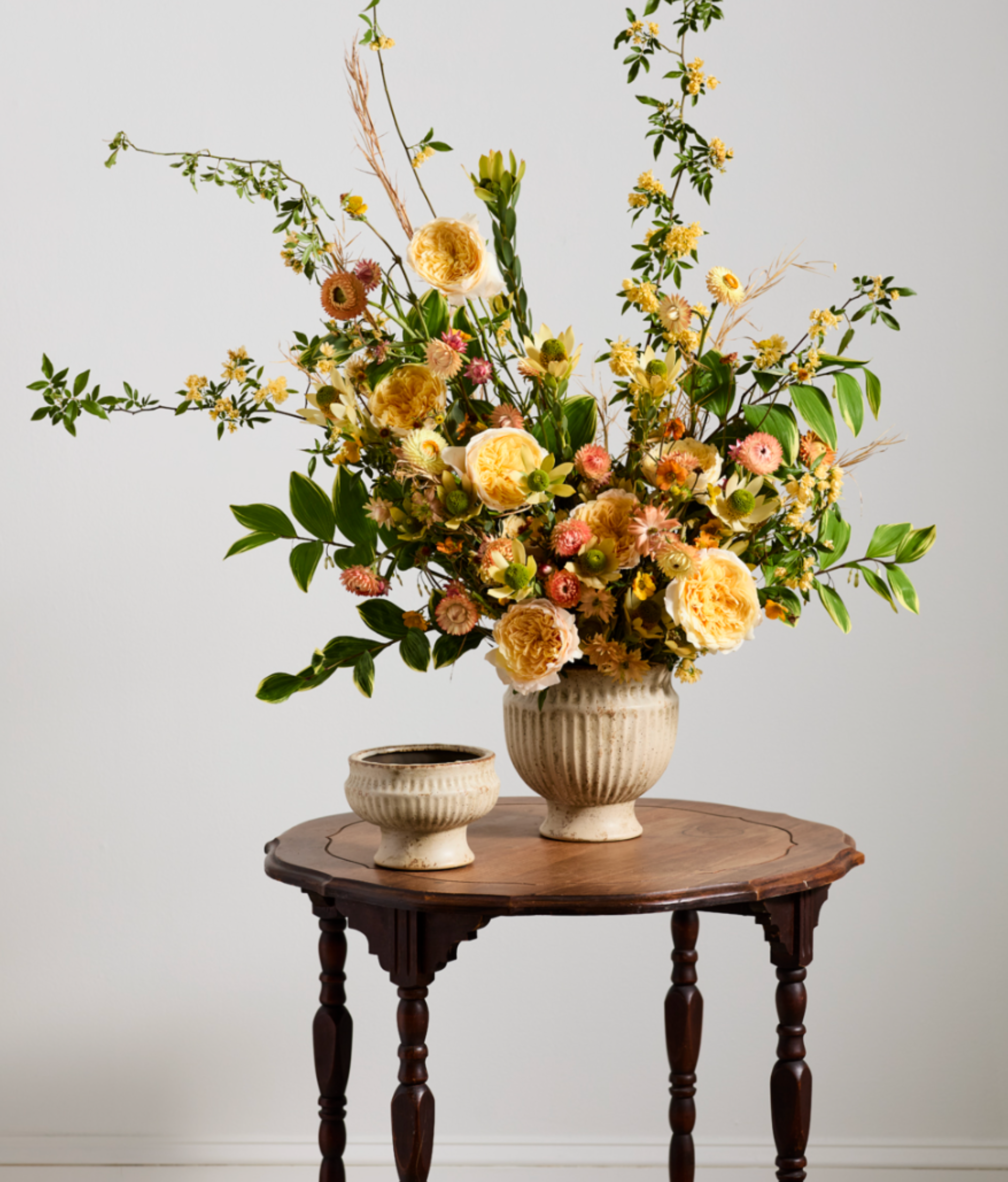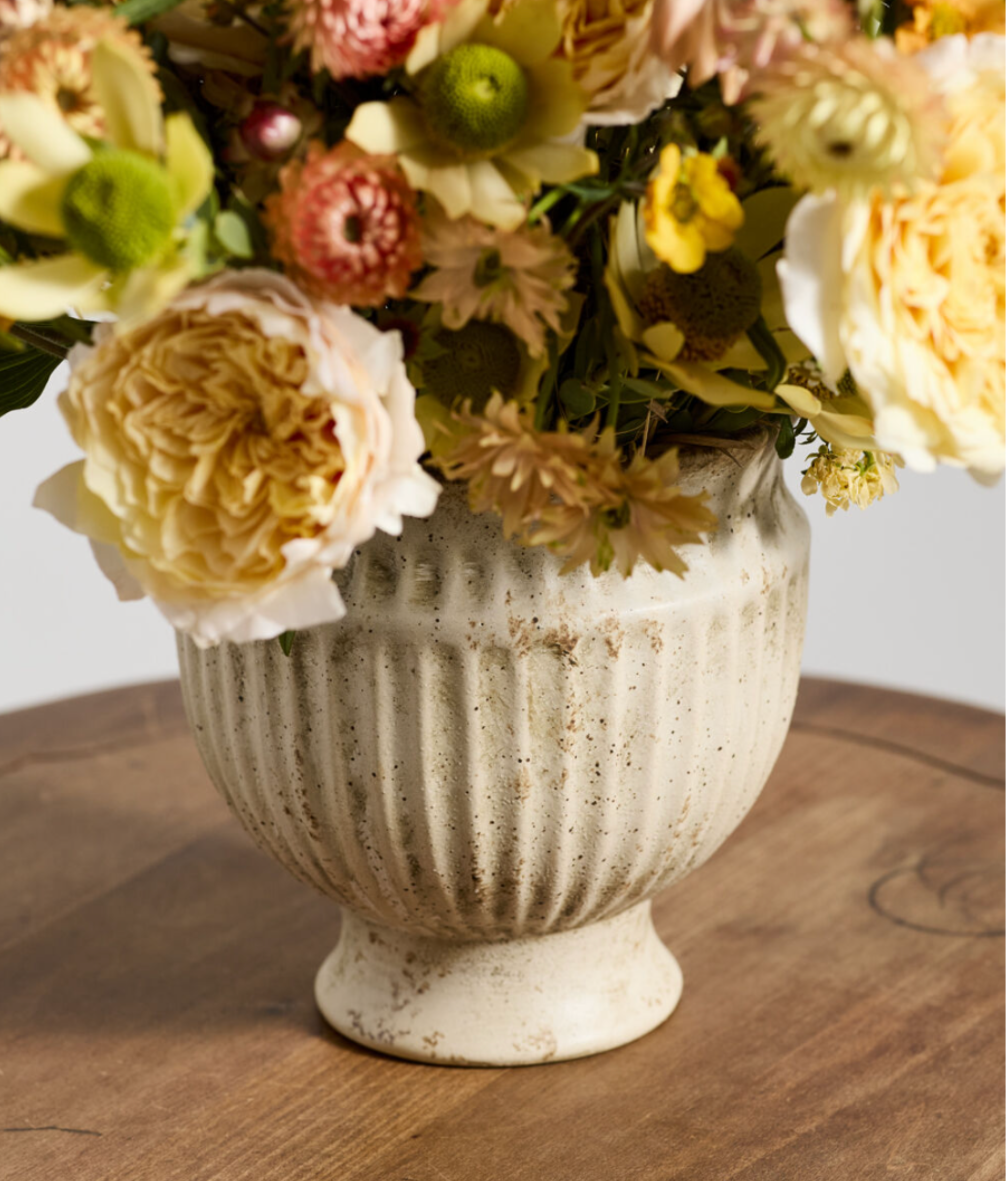 Set a traditional tone with the old-world inspired design of the lightweight ceramic Cadmus Urn. Featuring vertical ribbing across the surface & a slightly cinched, flared opening, this classic compote offers a nice scale & a neutral, aged colorway for an understated versatility. Whether used for events, floral design, home decor, or a 6-inch drop-in potted plant, this vessel rises to any occasion.