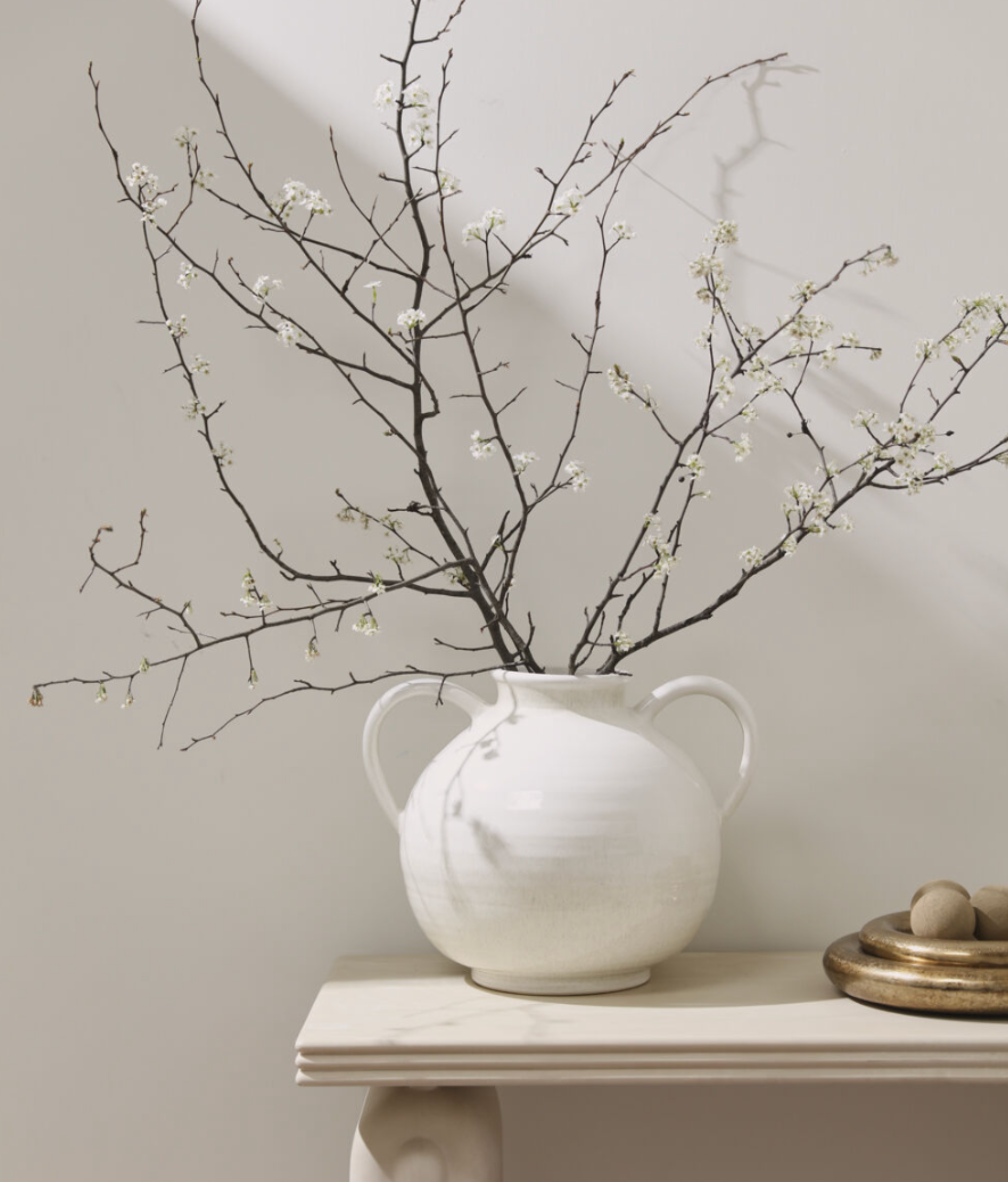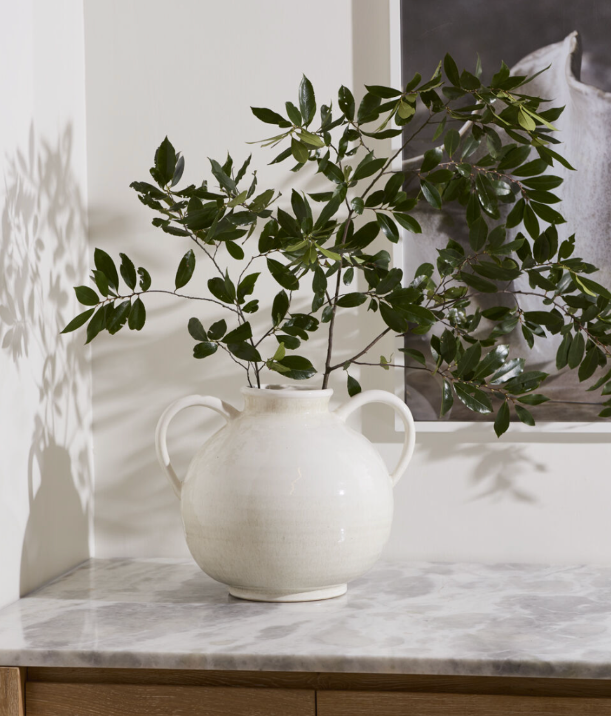 Perfect for displaying dried hydrangeas, branches, or blooms, the oversized ceramic Hampton Vase adds a timeless sophistication to home decor. Featuring matching handles & a glossy reactive white glaze that creates surface variation, the Hampton is also a stunning standalone vessel on shelves or a console table.