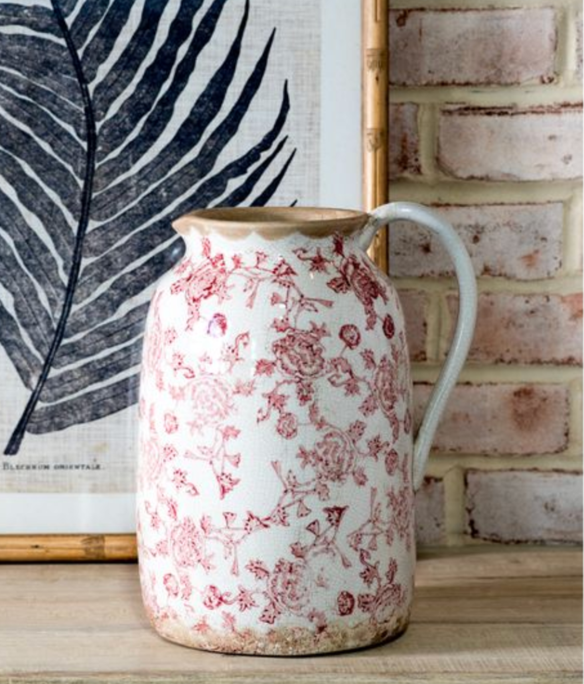 Introduce a touch of timeless, artisan-crafted charm to your home with this exquisite ceramic pitcher. The piece features a classic, bulbous silhouette adorned with an heirloom-inspired red and white floral motif, reminiscent of traditional French Toile de Jouy designs. Crafted from durable stoneware, the pitcher boasts a subtly crackled, high-gloss glaze across its body, beautifully contrasting with the natural, unglazed rim and a simple, elegant handle. This versatile vessel serves as a perfect standalone sculptural piece or a beautiful vase for displaying lush greenery or seasonal blooms.
